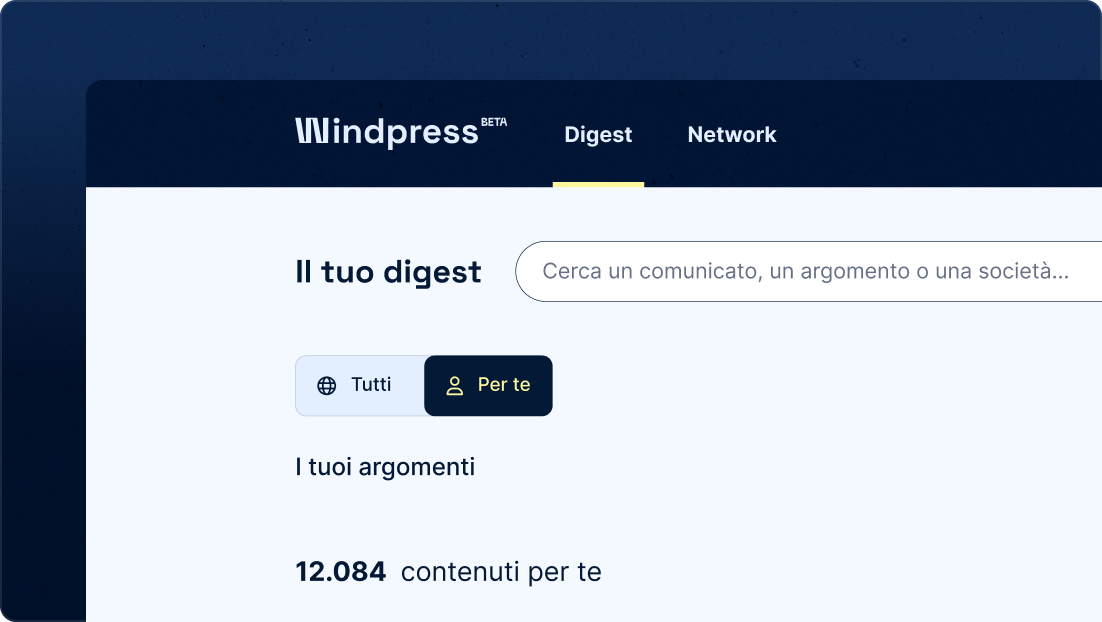 Windpress is the #1 press release portal in Italy: since 1999 it aggregates thousands of press releases and news, published every day by Companies, Entities and Associations both in Italy and abroad.