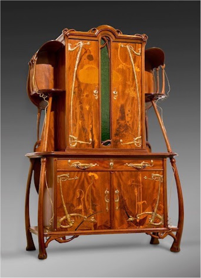 Atribuido al ebanista y diseñador francés Louis Majorelle (Toul,1859 – Nancy 1926), este Aparador de Cloisonné de Estilo Art Nouveau presenta formas envolventes que recuerdan al movimiento de las plantas y de la naturaleza en su conjunto, todo ello mediante maderas extranjeras como caoba, raíz de tuya teñida de verde y como punto culminante, su puerta central adornada con una escena única en cloisonné.
