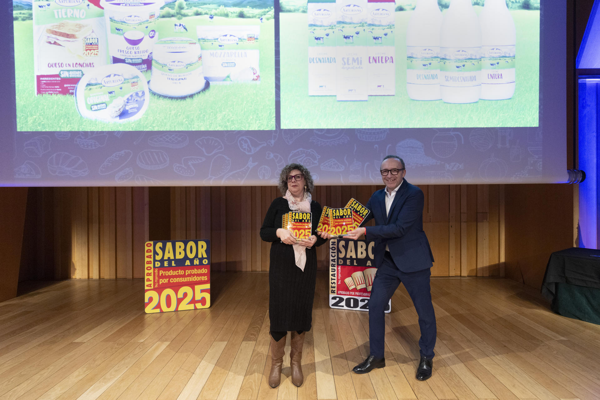 Representantes de la empresa Central Lechera Asturiana recogen varios galardones en los premios Sabor del Año 2025 que han distinguido este miércoles en Barcelona a más de cien productos alimentarios de venta al por menor y restauración por su calidad, sabor y contribución a la cultura gastronómica, un sello que ha llegado a doblar las ventas de productos premiados en 2024. EFE/Marta Pérez