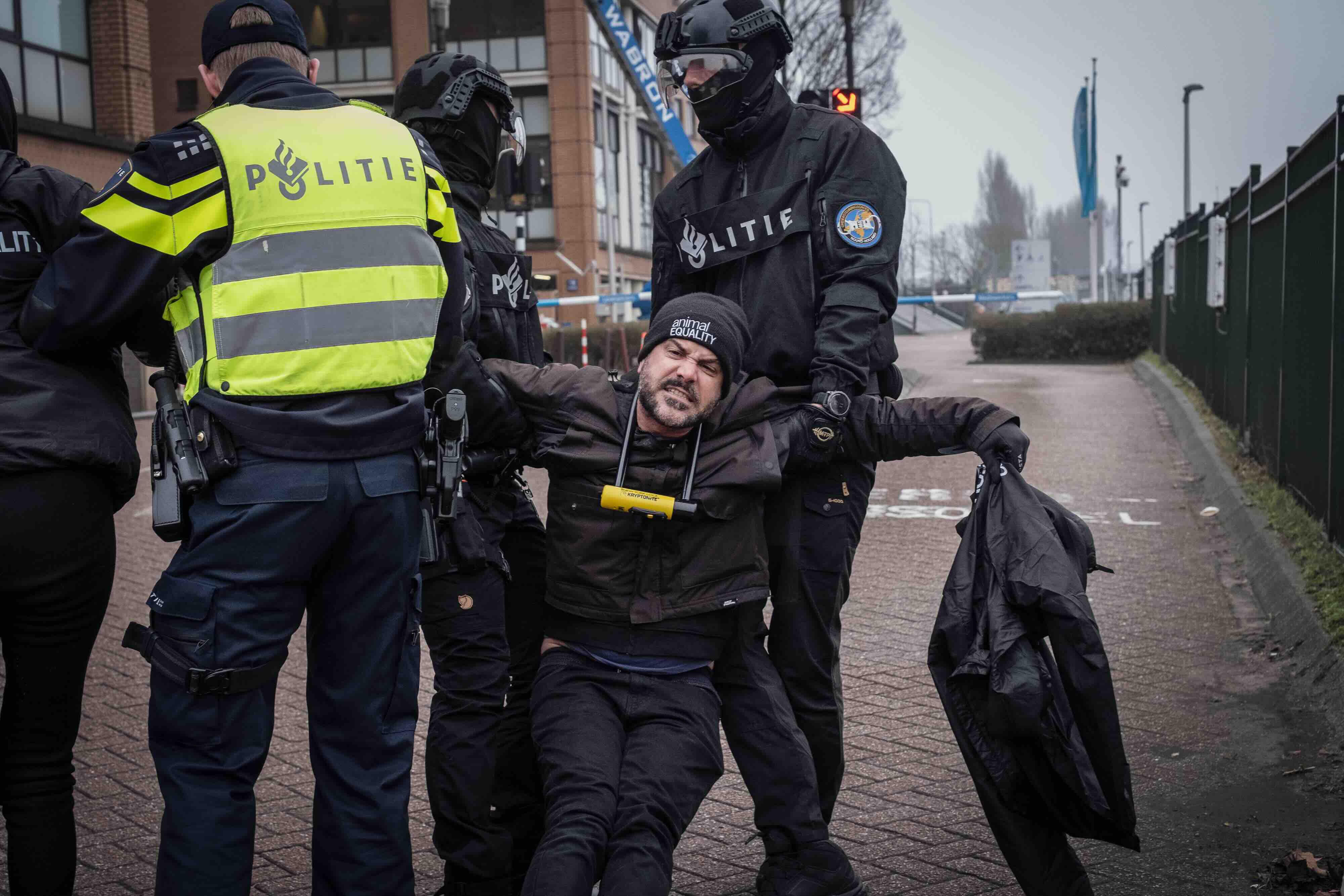 Los activistas han viajado desde Italia, Reino Unido, Portugal y España, y han permanecido encadenados desde las 7:30 de la mañana hasta las 12:30, cuando la policía utilizó radiales para cortar las cadenas y arrestar a los activistas, que ya han sido puestos en libertad sin cargos.