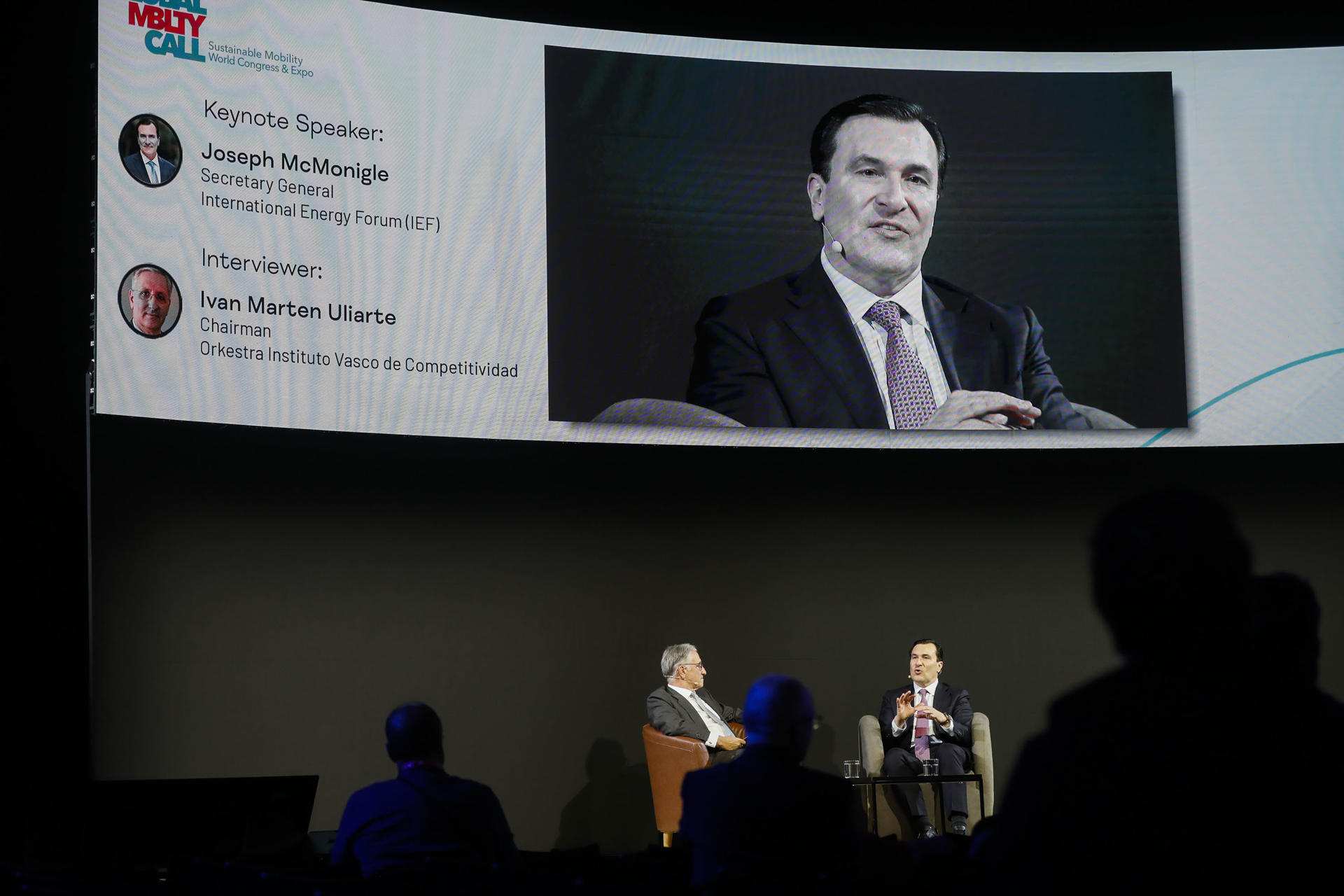 El presidente del Instituto vasco de Competitividad, Ivan Marten Uliarte (i), y el secretario general de International Energy Forum (IEF), Joseph McMonigle (d), en «Global Mobility Call». EFE/ David Fernández