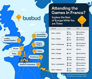 Visitors can explore the historic vineyards of Reims, the charming streets of Rouen, or the scenic landscapes of Etretat. For those with a bit more time, venturing further to Strasbourg or even across borders to Bruges, London, Amsterdam, or Geneva offers enriching experiences. Each destination is just a bus or train ride away, making it feasible to explore multiple cities during the Olympic season. For the full list of destinations, visit https://www.busbud.com/blog/heading-to-paris-for-the-games-heres-where-else-you-can-go/ [https://c212.net/c/link/?t=0&l=en&o=4219621-1&h=367350475&u=https%3A%2F%2Fwww.busbud.com%2Fblog%2Fheading-to-paris-for-the-games-heres-where-else-you-can-go%2F&a=https%3A%2F%2Fwww.busbud.com%2Fblog%2Fheading-to-paris-for-the-games-heres-where-else-you-can-go%2F]