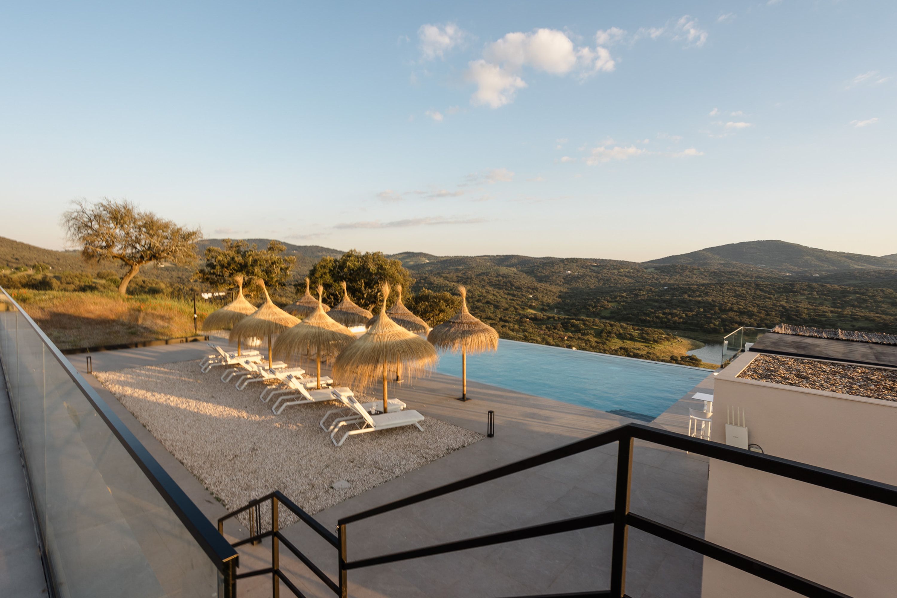La terraza panorámica del hotel, con sus impresionantes vistas sobre la dehesa, se ha consolidado como uno de los espacios favoritos de los huéspedes y visitantes. Cada tarde, las puestas de sol desde este enclave se convierten en un espectáculo inolvidable, acompañado de una copa de vino y una tabla de ibéricos, en un ambiente que invita a detener el tiempo.