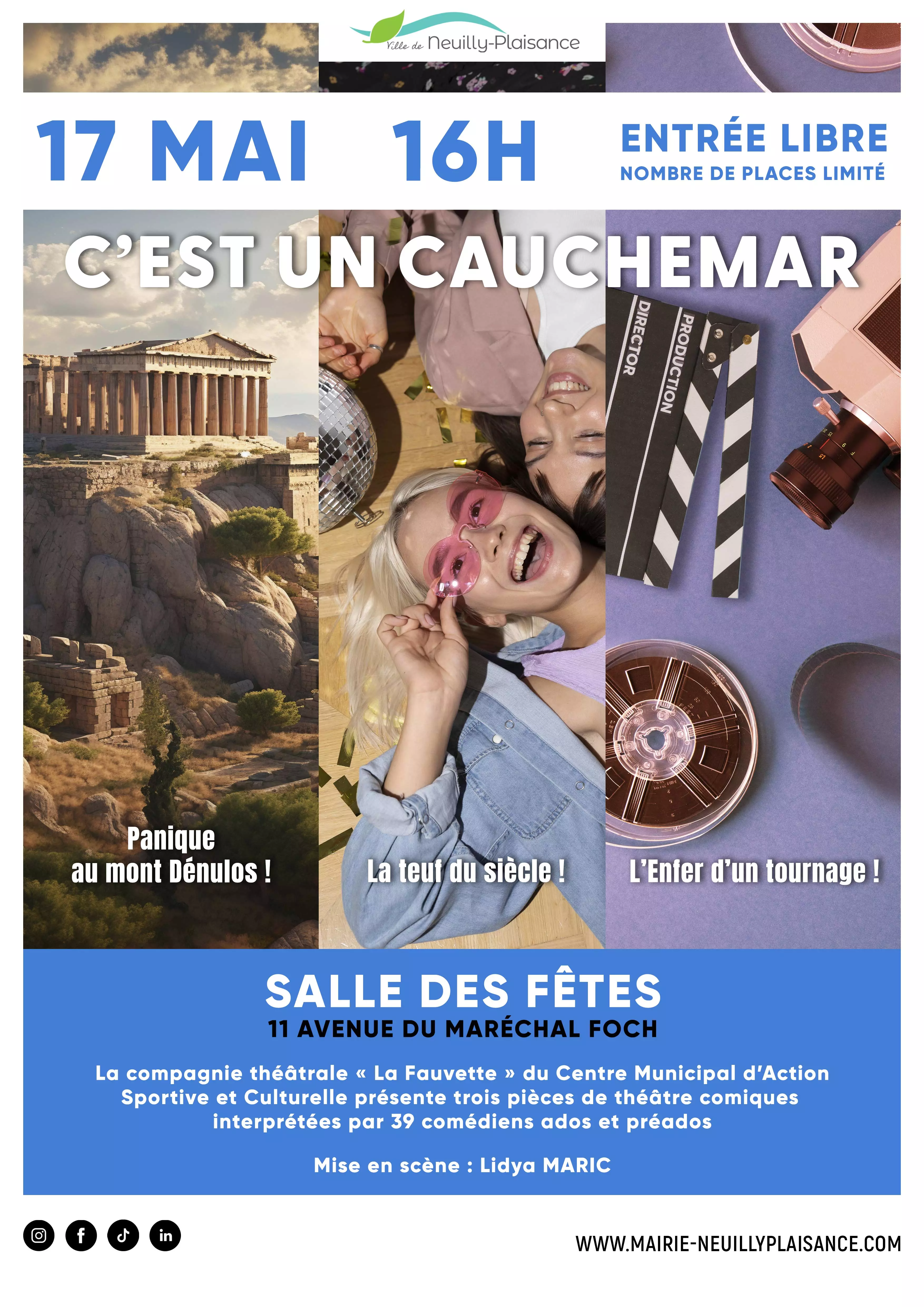 Trois pièces de théâtre comiques interprétées par 39 comédiens ados et préados : « Panique au Mont Dénulos ! », « La Teuf du siècle ! », « L’Enfer d’un tournage ! »