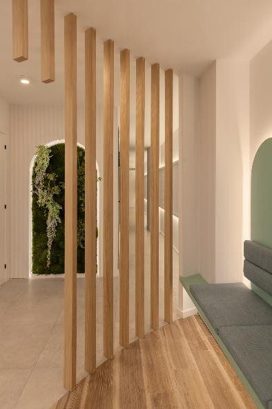 El arco, como elemento icónico, se retoma en la pared de acceso principal —donde enmarca el rótulo retroiluminado— y también en el lateral contiguo a la sala de espera, donde se ubica un jardín vertical que aporta frescura y un contacto visual con la naturaleza.