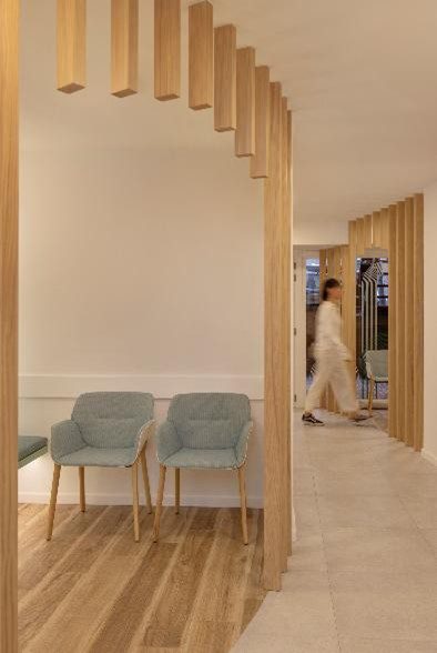 Para corregir la rigidez lineal del espacio, Strada Interiors ha apostado por las líneas sinuosas en el diseño de circulación y en los elementos clave del programa. Las dos salas de espera, por ejemplo, se definen mediante listones de madera dispuestos en altura que dibujan una forma circular envolvente y delimitan ambas zonas de manera visual y funcional. El mostrador principal, de planta curva, se extiende lateralmente y se transforma en un banco continuo, integrando funcionalidad y diseño en un solo gesto arquitectónico.