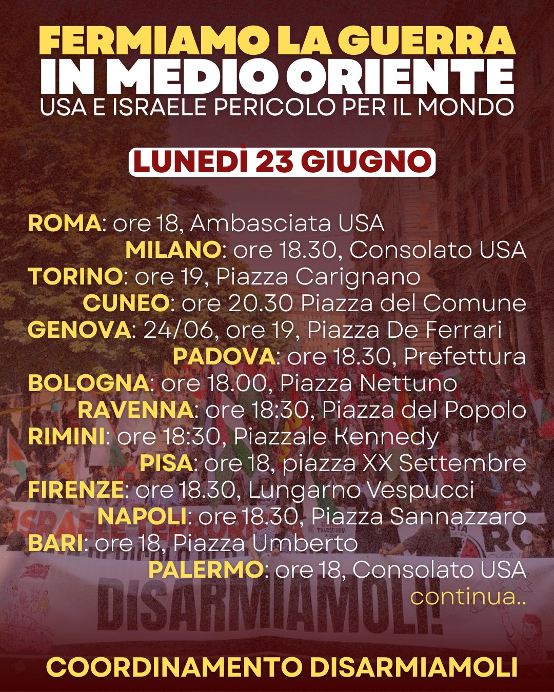 Nessuno può davvero credere che Trump si fermi dopo una notte di bombardamenti, nessuno può credere che la via della pace si costruisca bombardamento dopo bombardamento, nessuno può davvero credere di restare fuori dalla guerra restando nella NATO e in tutte le forme di alleanza tra USA, UE e Israele. Per questo lunedì 23 giugno chiamiamo tutte le persone che avvertono l'urgenza di lottare per la pace a un primo appuntamento cittadino con un presidio alle ore 18 davanti all'Ambasciata statunitense.