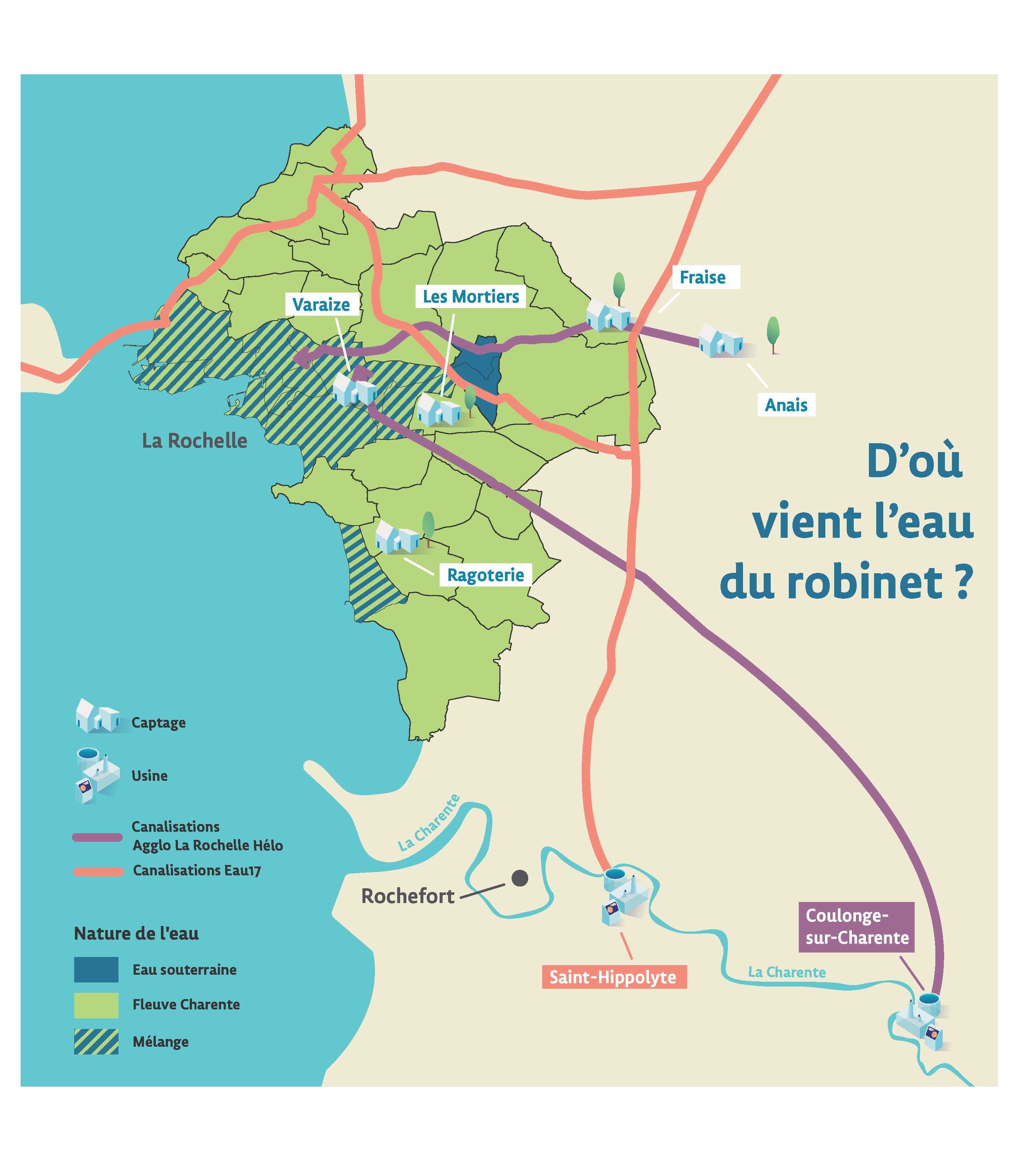 - Les nappes souterraines, en Saintonge à proximité de l’usine de Coulonge, et en Aunis sur quatre secteurs: La Ragotterie (commune de Salles/Mer) pour l’alimentation de la Ville de Chatelaillon, Varaize (commune de Périgny), Casse-Mortier (commune de Clavette), et Fraise (commune de Vérines) / Anais. Cette dernière ressource alimente la commune de La Rochelle depuis un siècle.