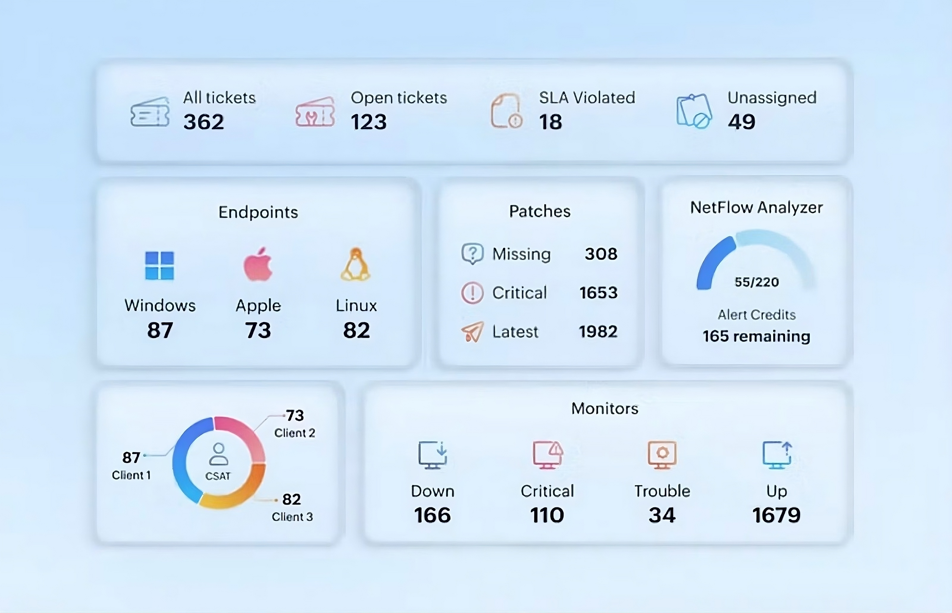 Gestione clientes de forma segura con RMM (Monitoreo y Gestión Remota), PSA (Automatización de Servicios Profesionales) integrados y monitoreo avanzado de servidores en una plataforma multi-inquilino y basada en roles.