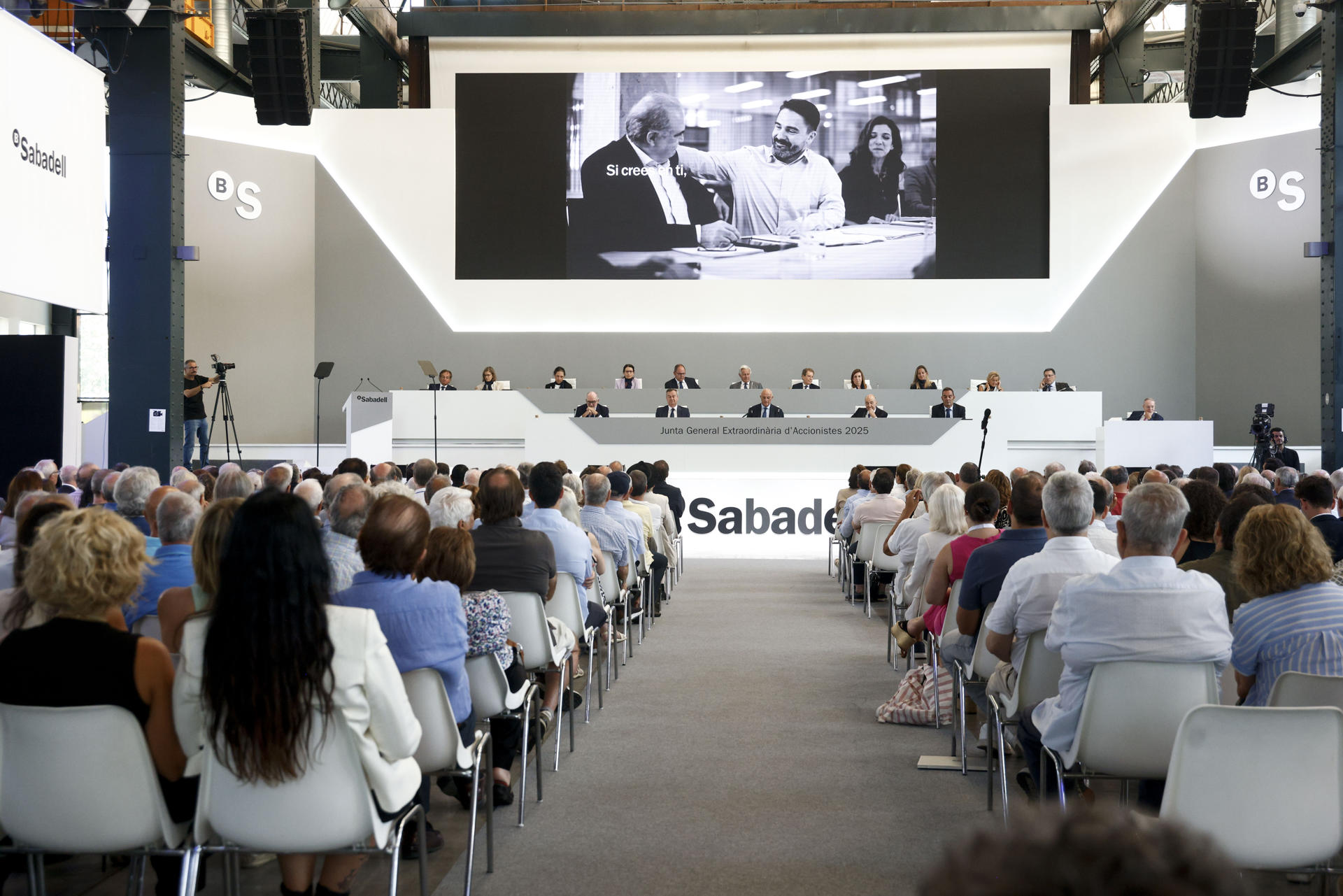 SABADELL (BARCELONA), 06/08/2025.- Junta General Extraordinaria de Accionistas que celebra este miércoles el Banco Sabadell para decidir sobre la venta de la filial británica TSB al Santander.EFE/ Quique García