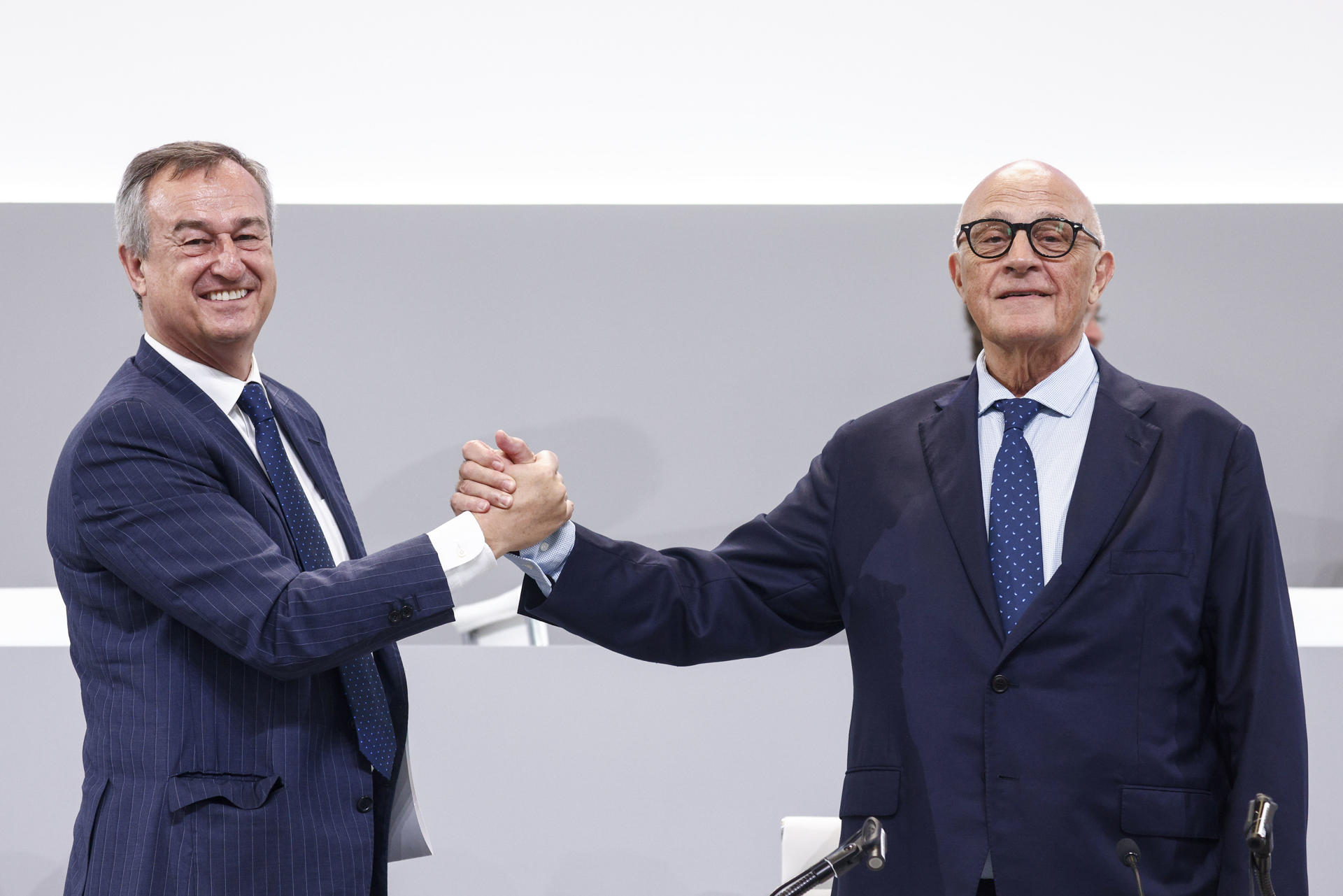 BARCELONA, 06/08/2025.- El presidente del Banco Sabadell, Josep Oliu (d) y el consejero delegado, César González-Bueno (i), se felicitan tras la junta general extraordinaria de accionistas de la entidad, que ha aprobado este miércoles un dividendo extraordinario de 2.500 millones de euros vinculado a la venta de la filial británica TSB, operación a la que han dado también luz verde esta mañana en una junta previa. EFE/ Quique García