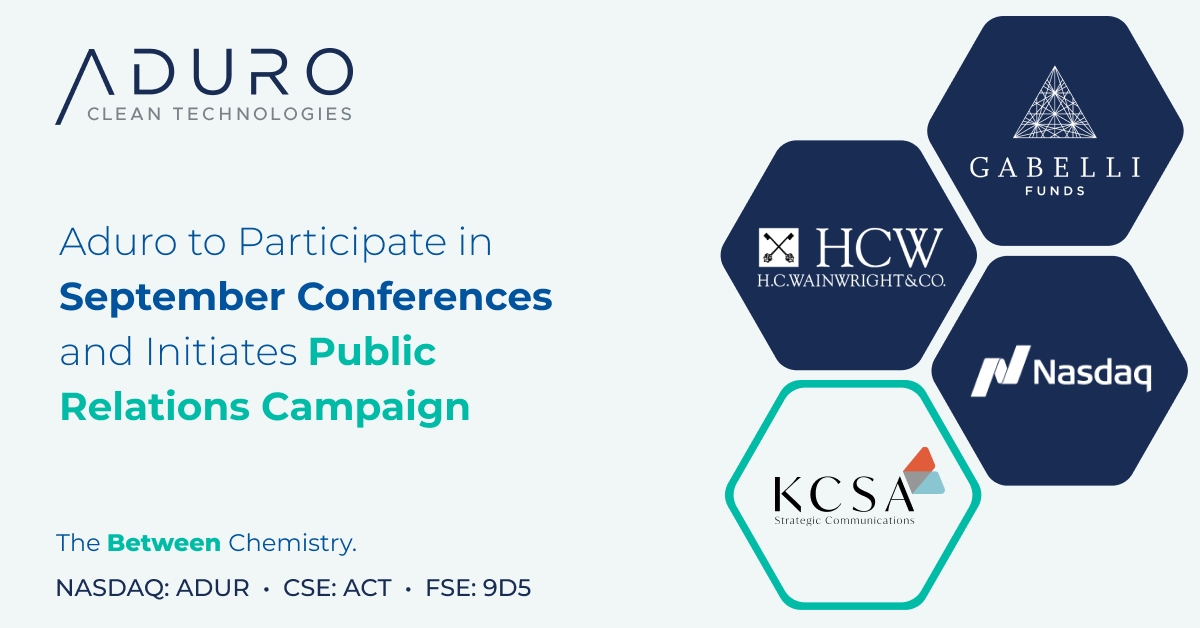 LONDON, Ontario, Sept. 04, 2025 (GLOBE NEWSWIRE) -- Aduro Clean Technologies Inc. (“Aduro” or the “Company”) (Nasdaq: ADUR) (CSE: ACT) (FSE: 9D5), a clean technology company using the power of chemistry to transform lower-value feedstocks, like waste plastics, heavy bitumen, and renewable oils, into resources for the 21st century, announced its participation in several investor and industry events in September 2025, including the Nasdaq New York Climate Week Forum. The Company also announced that it has initiated a public relations campaign with KCSA Strategic Communications, as part of its efforts to build the Company’s brand and industry visibility.