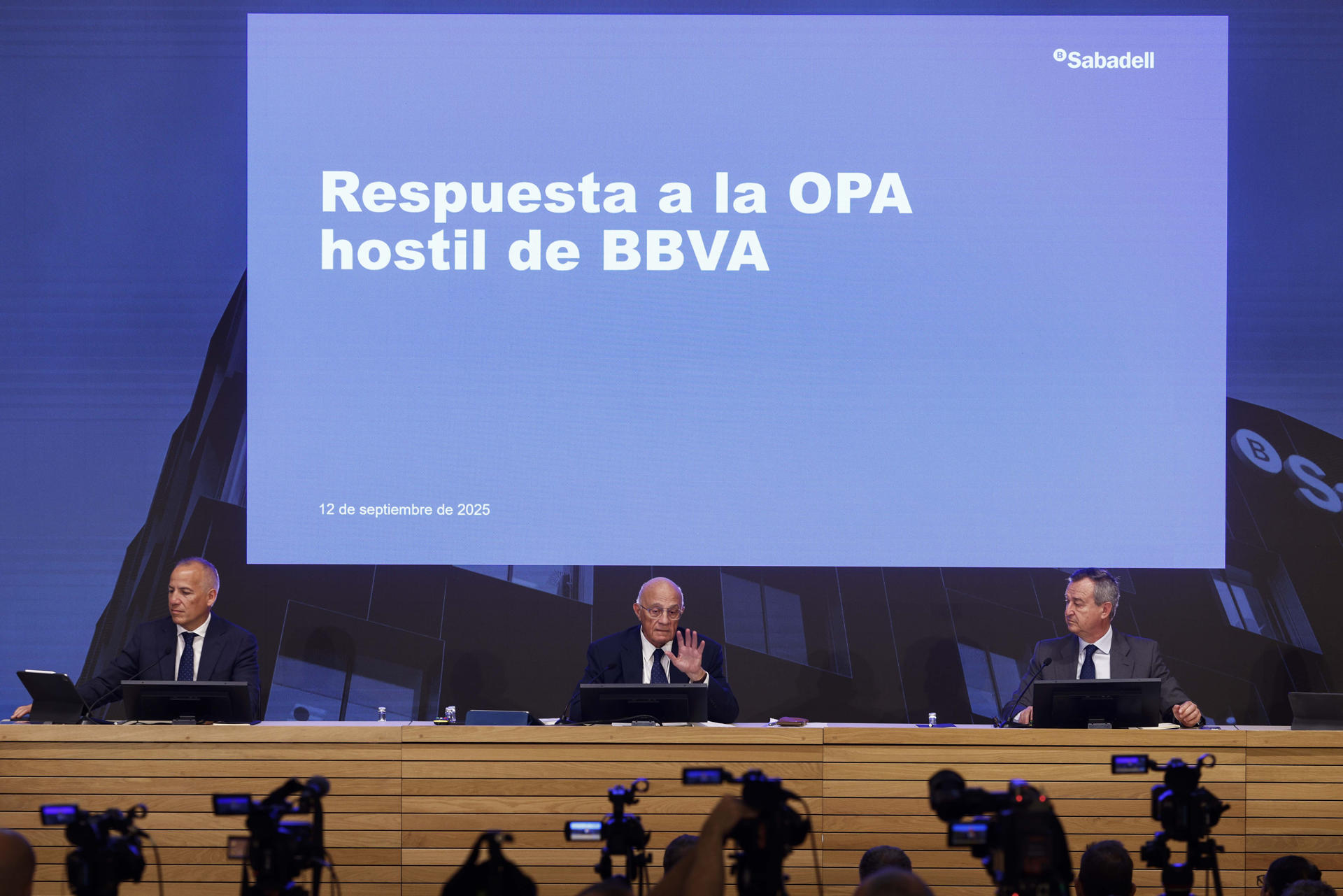 El presidente de Banco Sabadell, Josep Oliu (c), el consejero delegado, César González-Bueno (d), y el director financiero, Sergio Palavecino (i), durante la rueda de prensa en la que se ha anunciado que el consejo de administración del Banco Sabadell rechaza por unanimidad la opa hostil de BBVA por la entidad, al considerar la oferta «insuficiente» y por «infravalorar» al banco catalán, por lo que recomienda a sus accionistas no aceptarla.EFE/ Quique García