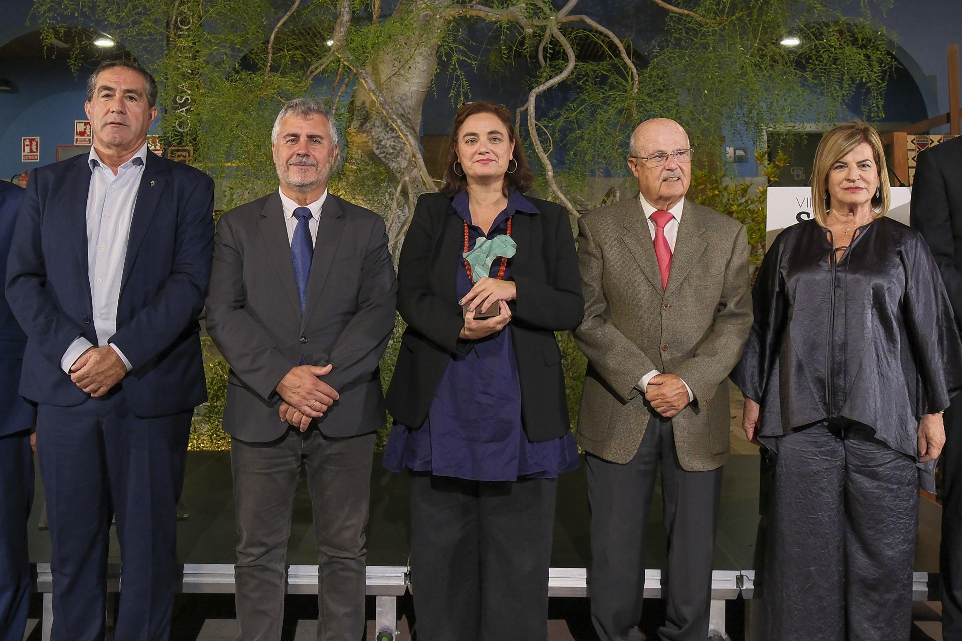 (i-d) El viceconsejero de Bienestar Social, Francisco Candil, el presidente de la Agencia EFE, Miguel Ángel Oliver, la periodista Ana Carbajosa, el director general de Casa África, José Segura y la concejala capitalina de Fiestas, Inmaculada Medina, durante el acto de entrega del premio Saliou Traoré al equipo de Planeta Futuro celebrado hoy martes en el patio central de la sede de Casa África en Las Palmas de Gran Canaria. EFE/Ángel Medina G.