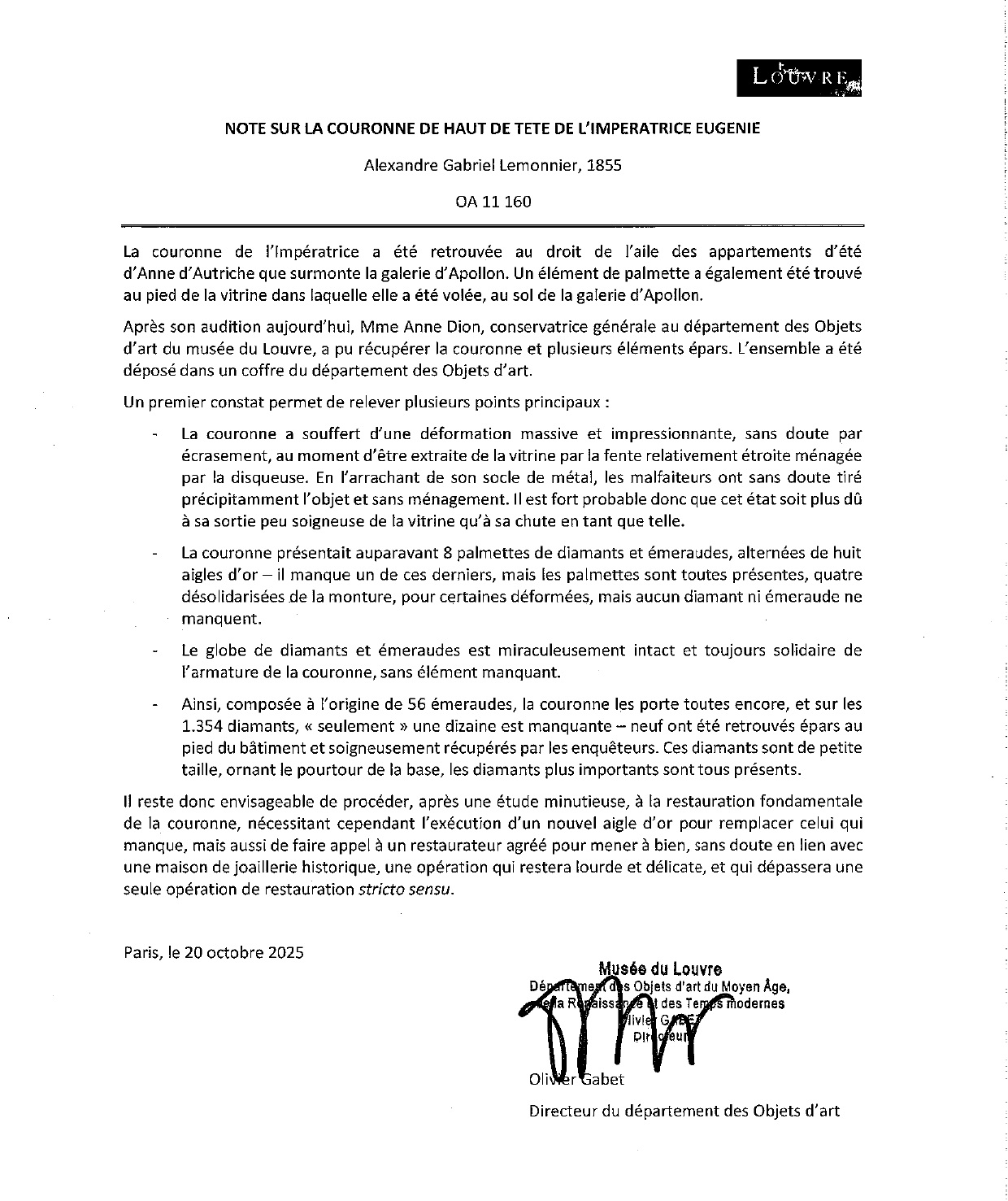 Note du 20 octobre 2025 du directeur du département des Objets d’art du musée du Louvre sur l’état de la couronne de l’impératrice Eugénie. Document communiqué le 6 janvier 2026 à Sites & Monuments.
