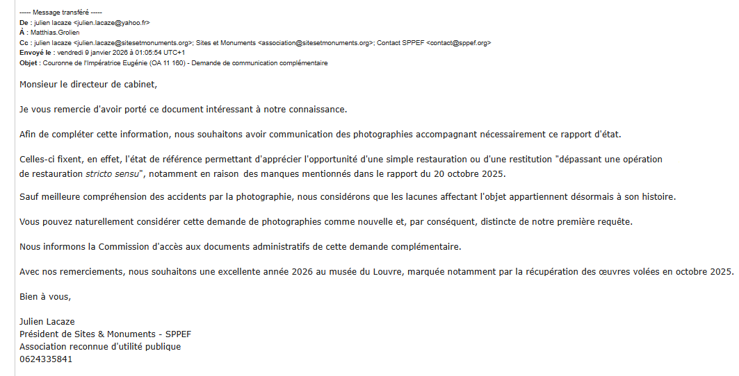 Nous n’en maintenons pas moins notre demande de communication des photographies accompagnant nécessairement le rapport d’état. Comme nous l’écrivions au Louvre le 9 janvier, sauf meilleure compréhension des accidents par l’image, nous considérons que les lacunes affectant la couronne de l’impératrice Eugénie appartiennent désormais à son histoire, comme à celle du musée. C’est pourquoi, "l’exécution d’un nouvel aigle d’or", envisagée dans la note du 20 octobre 2026, nous semblerait trompeuse pour le public.