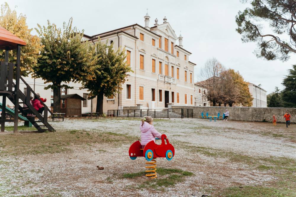 La scuola dell’Infanzia nasce dentro Villa Fietta, davanti a un parco naturale di otto ettari con alberi secolari. Un contesto che non è semplice cornice, ma parte integrante del progetto educativo. L’approccio, nato dall’esperienza della rete internazionale delle Scuole Lasalliane, frutto di oltre 10 anni di ricerca, si snoda attorno al concetto di “roots” (radici), punta su un’educazione immersiva, a stretto contatto con la natura e con gli spazi, in una scuola volutamente a dimensione contenuta: trenta bambini, seguiti in un percorso di reale bilinguismo con trenta ore settimanali in lingua inglese affidate a docenti madrelingua. Anche la cucina diventa parte della proposta pedagogica, con pasti preparati internamente, sul posto anche attraverso lo sviluppo di attività di manualità condivisa con i bambini, a sottolineare il valore educativo del cibo e della quotidianità condivisa.