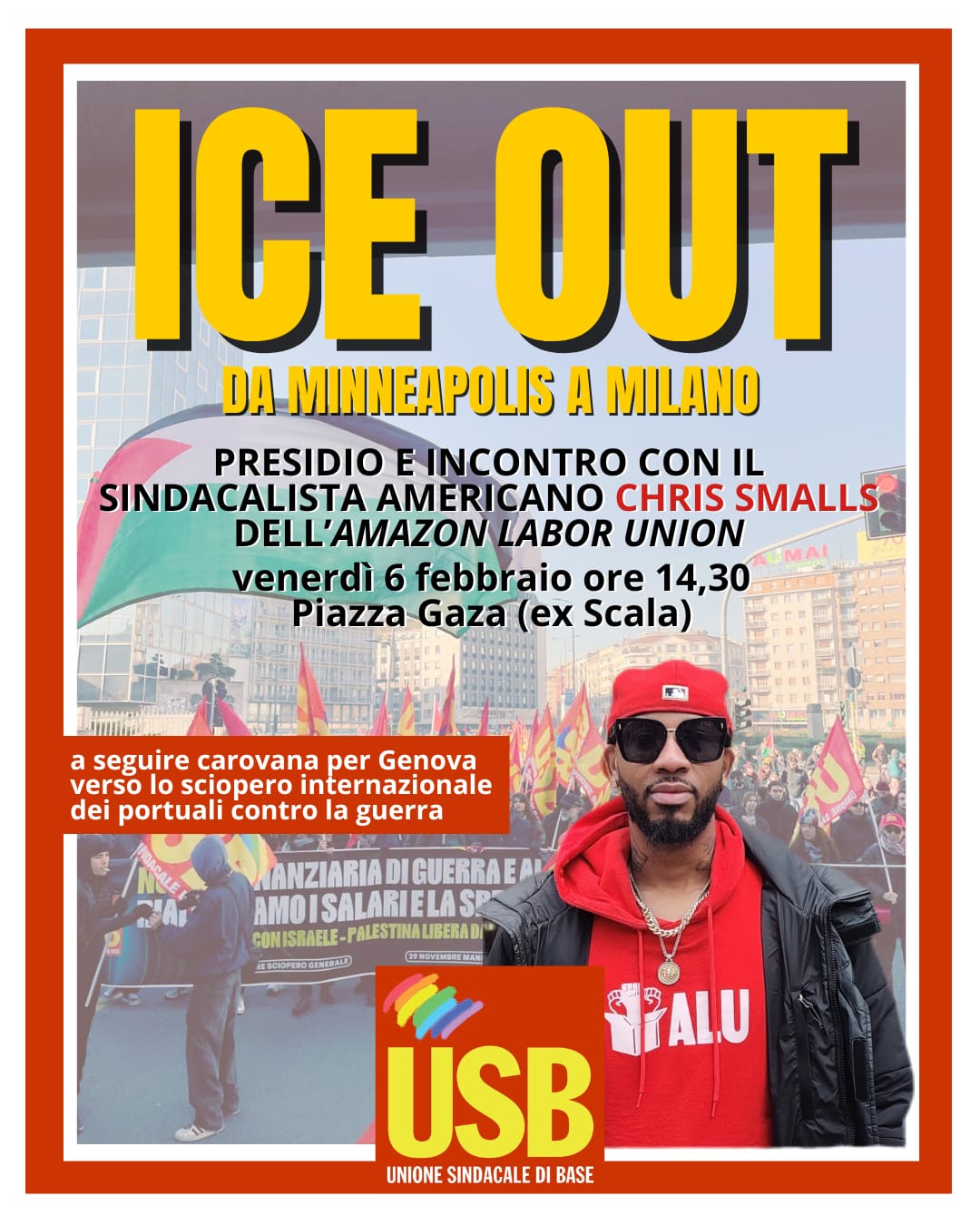 - il 6 febbraio a Milano alle 14.30 in Piazza Gaza (ex Scala) con lo slogan “ICE OUT!" dopo la quale l’iniziativa poi si sposterà in carovana a Genova in occasione dello sciopero internazionale dei porti
