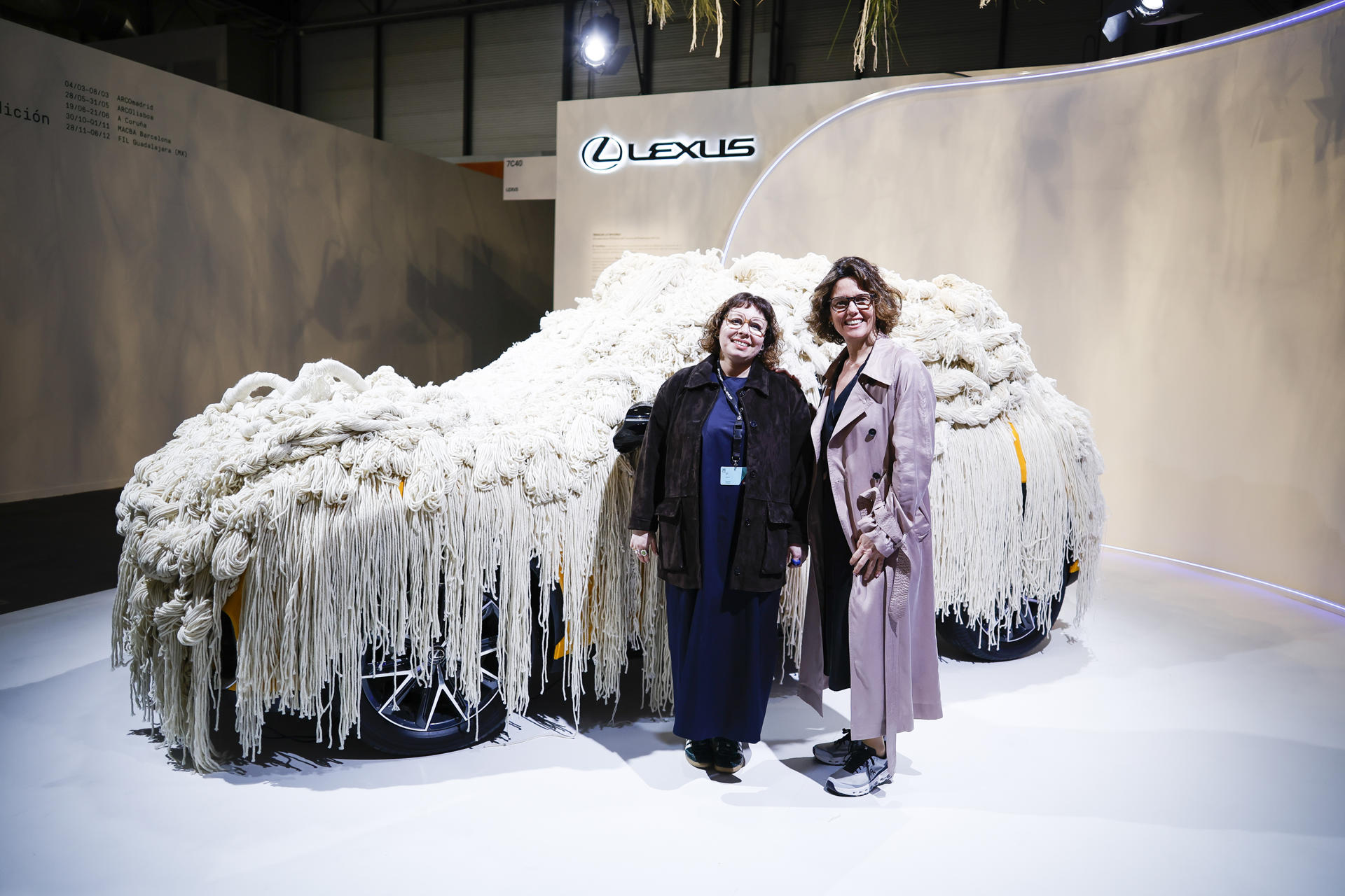 MADRID, 04/03/2026.- La artista Mariadela Araujo (i), ganadora de la VIII edición del concurso ‘Diseño Lexus Art Car’ y Mar Pieltain, directora de Lexus España, posa junto a la obra ‘Trenzar lo invisible’ en el stand de Lexus, durante la primera jornada, este miércoles, de la Feria Internacional de Arte contemporáneo ARCO 2026 que se celebra en las instalaciones de IFEMA, en Madrid. EFE/David Fernández