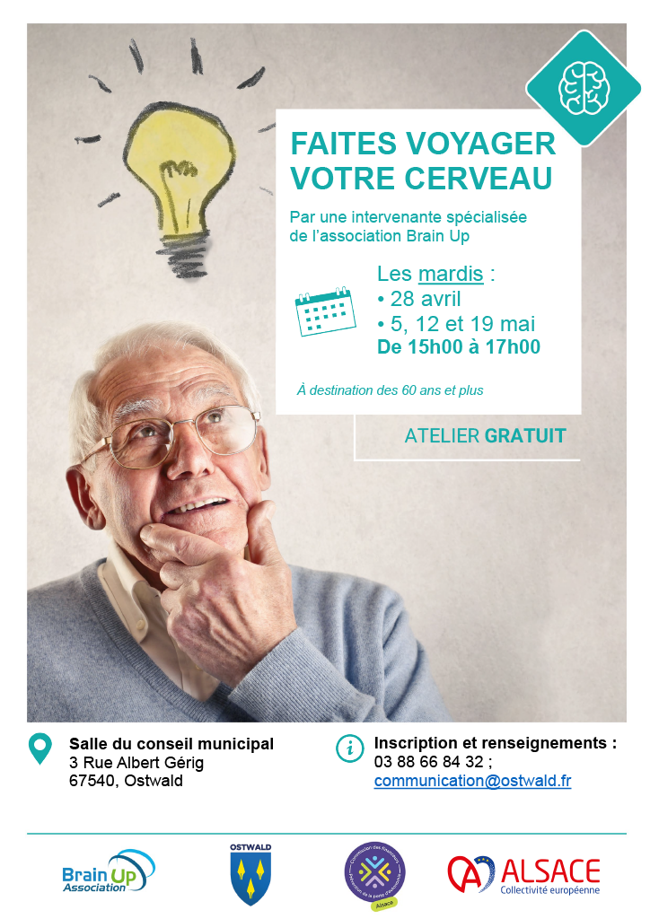 L’association Brain Up et la ville d’Ostwald vous proposent un atelier ludique et interactif autour du cerveau pour bien en prendre soin compte tenu des effets du temps. L’objectif est d’accompagner et de conseiller les personnes âgées face à ces nouveaux défis.