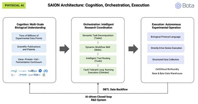 Through Bota's proprietary Biological Protocol Language, SAION AI converts experimental designs into standardized instructions that directly drive laboratory hardware, feeding real-world data back into the Cognition Layer, enabling continuous model improvement and R&D acceleration.