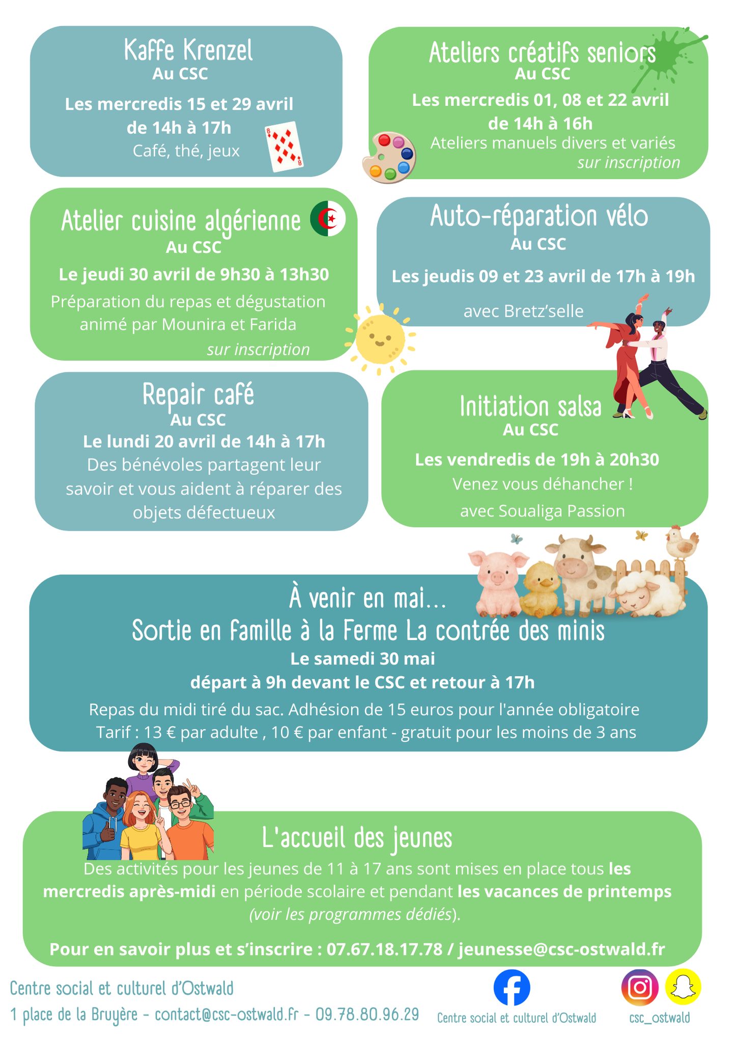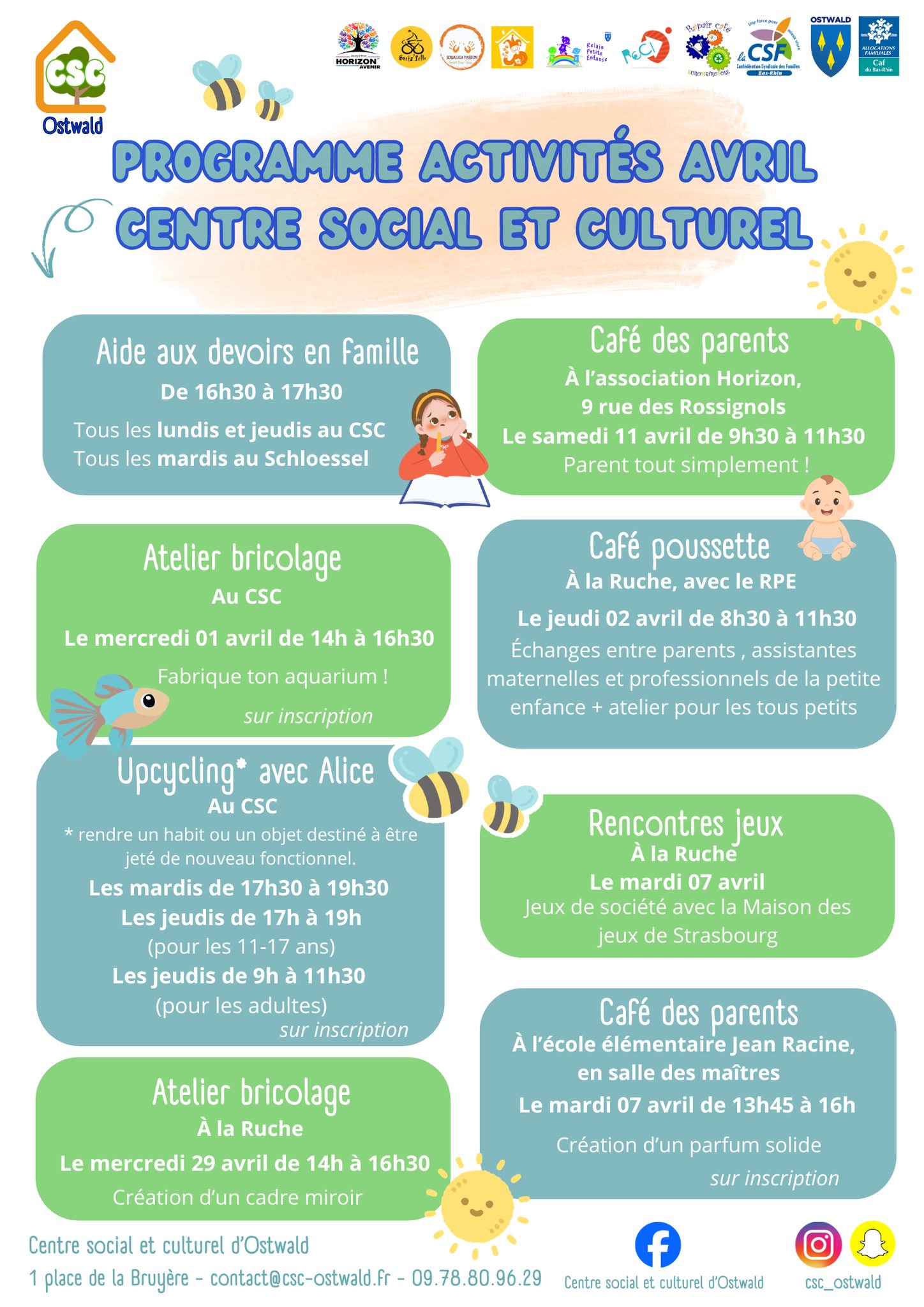 Découvrez le planning d’avril concocté par l’équipe du Centre Social et Culturel d’Ostwald et toutes les informations du CSC sur leur page dédiée.