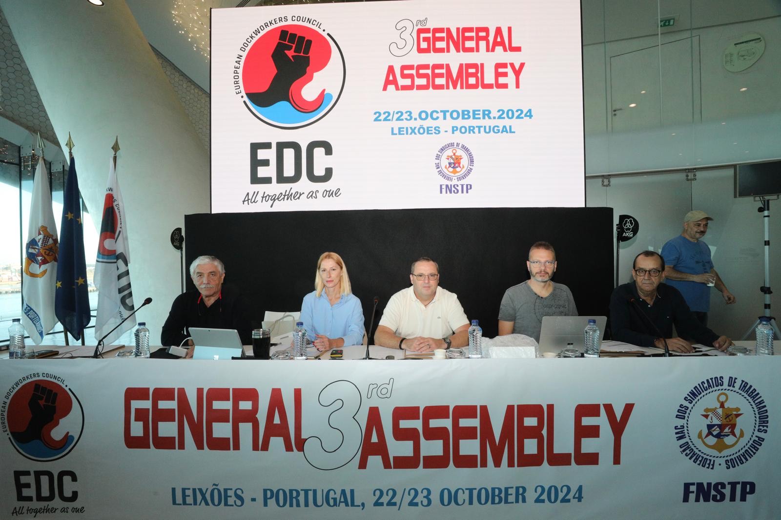 Más de un centenar de estibadores y trabajadores portuarios de Europa mostraron su compromiso en la defensa de un empleo estable y de calidad en los puertos durante la III Asamblea General celebrada por la organización European Dockworkers Council (EDC) en el Puerto de Leixões de la ciudad lusa de Matosinhos.