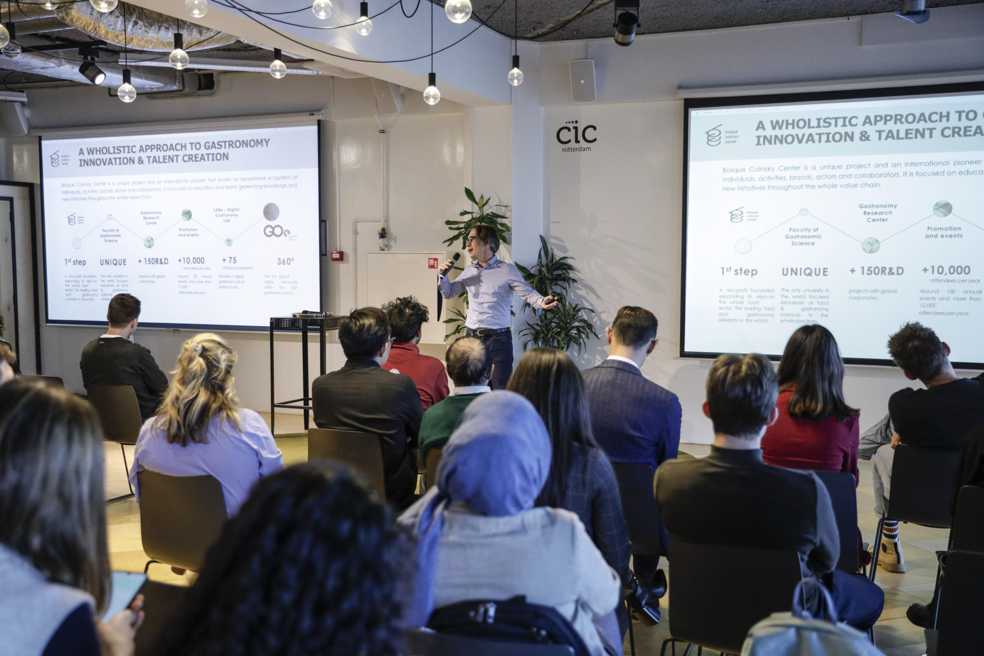 RÓTERDAM (PAÍSES BAJOS), 24/10/2024.- Asier Alea, director de desarrollo global del Basque Culinary Center, interviene en «Culinary Action! On The Road», un evento organizado junto a su socio local Cambridge Innovation Center (CIC) este jueves, en Róterdam (Países Bajos), y que ha acogido diferentes perfiles del sector, incluidos emprendedores, inversores y expertos, y donde se han escuchado propuestas de cuatro emprendedores gastronómicos. La ‘startup’ neerlandesa Effium, especializada en diseño de sartenes de alto rendimiento sostenibles y eficientes en energía, ha sido elegida este jueves la ganadora del Culinary Action! On The Road, programa internacional creado por el Basque Culinary Center (BCC), que promueve el emprendimiento en gastronomía