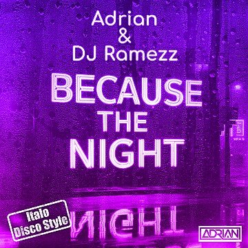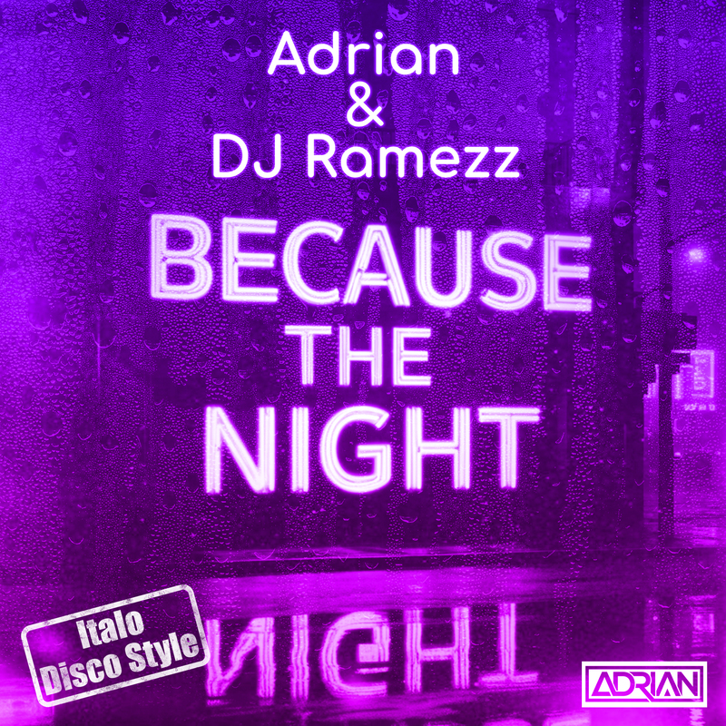 Con un passato ricco di successi alle spalle, Adrian fa rivivere uno dei pezzi più iconici della storia della musica rock, riportandolo alla ribalta in una veste tutta nuova. "Because The Night", già riscoperto nel 1993 dai 10,000 Maniacs, oggi torna in tre versioni, l’Extendend Version, la Radio Edit in stile Eurodance ed una specialissima Italo Disco version realizzata esclusivamente per i club ed il pubblico italiano. Tre differenti abiti cuciti ad hoc su un pezzo immortale, tre adattamenti capaci di unire il passato con le nuove tendenze musicali. Il messaggio resta quello imperituro dell’originale: la notte come spazio in cui le emozioni e i desideri prendono vita, creando una dimensione sospesa che il giorno non riesce a toccare.