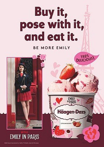 Häagen-Dazs' limited-edition Emily in Paris ice cream collection is now available in stores and Häagen-Dazs Shops around the world, where consumers can celebrate this delightful union of flavour and style, and discover how they can Be More Emily with Häagen-Dazs.
