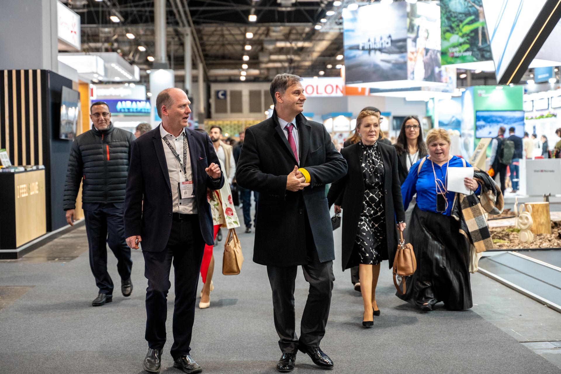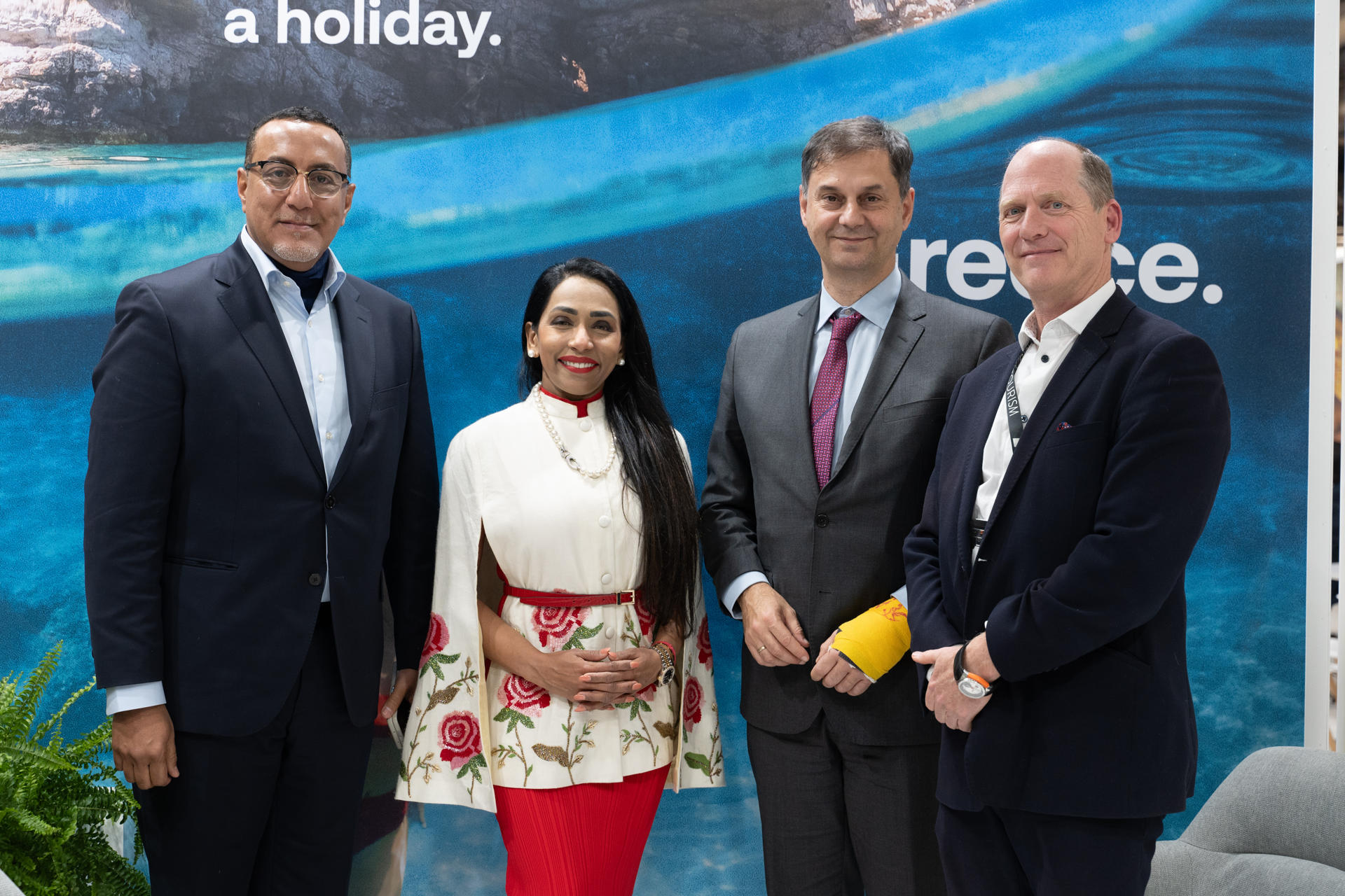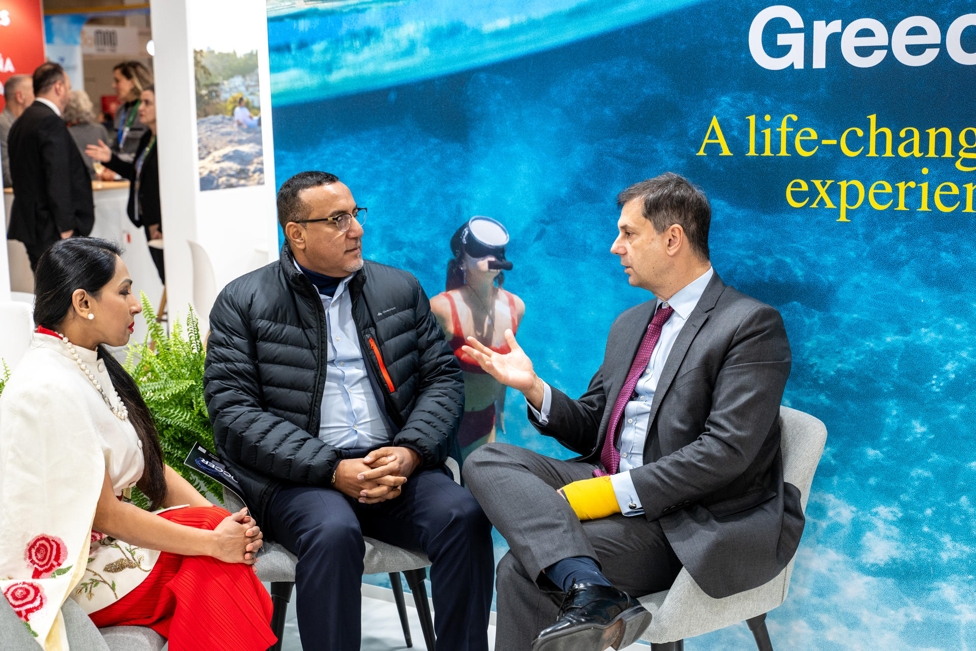 MADRID, 24/01/2025.- El exministro griego y candidato a secretario general de ONU Turismo, Harry Theoharis (2d), en una entrevista con EFE en la Feria Internacional de Turismo Fitur, celebrada en Ifema Madrid, afirma que cree que es necesario «vigilar» el «fenómeno emergente» del turismo masivo y considera que la organización que aspira a liderar está en una «posición única» para evaluar estrategias y asesorar a los países miembros que se enfrentan a este problema. EFE/Fernando Villar