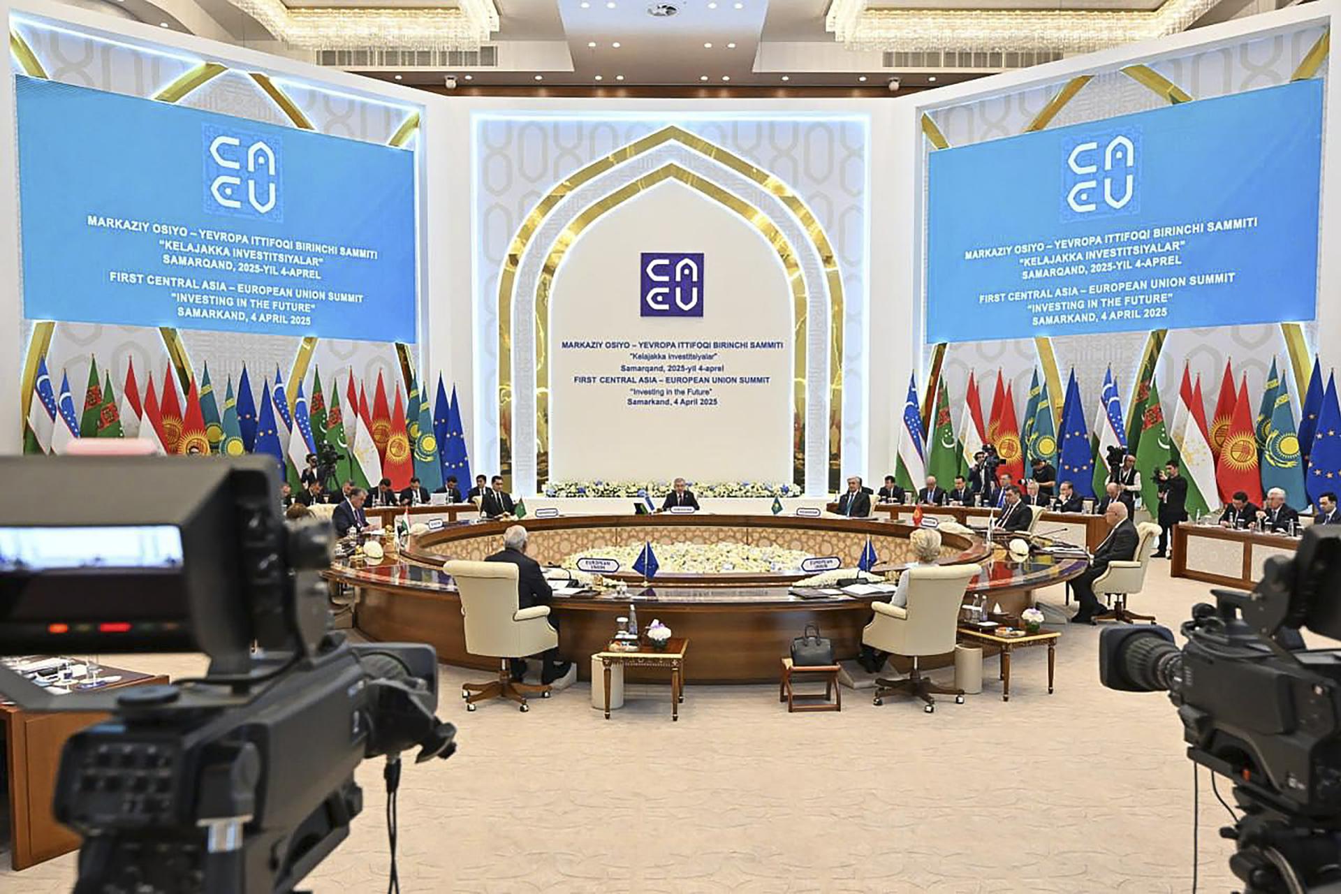 SAMARCANDA (Uzbekistán), 04/04/2025. – Fotografía distribuida por el servicio de prensa del presidente de Kirguistán que muestra al presidente de Tayikistán, Emomali Rahmon, al presidente de Kazajistán, Kasim-Yomart Tokáyev, al presidente del Consejo Europeo, Antonio Costa, al presidente de Uzbekistán, Shavkat Mirziyóyev, a la presidenta de la Comisión Europea, Ursula von der Leyen, al presidente de Turkmenistán, Serdar Berdimuhamedow, y al presidente de Kirguistán, Sadyr Japarov, asistiendo a la cumbre UE-Asia Central en Samarcanda, Uzbekistán, el 4 de abril de 2025. EFE/EPA/SERVICIO DE PRENSA DE LA PRESIDENCIA DE KIRGUISTÁN / MATERIAL DE DIFUSIÓN USO EDITORIAL SOLAMENTE/NO A LA VENTA MATERIAL DE DIFUSIÓN USO EDITORIAL SOLAMENTE/NO A LA VENTA