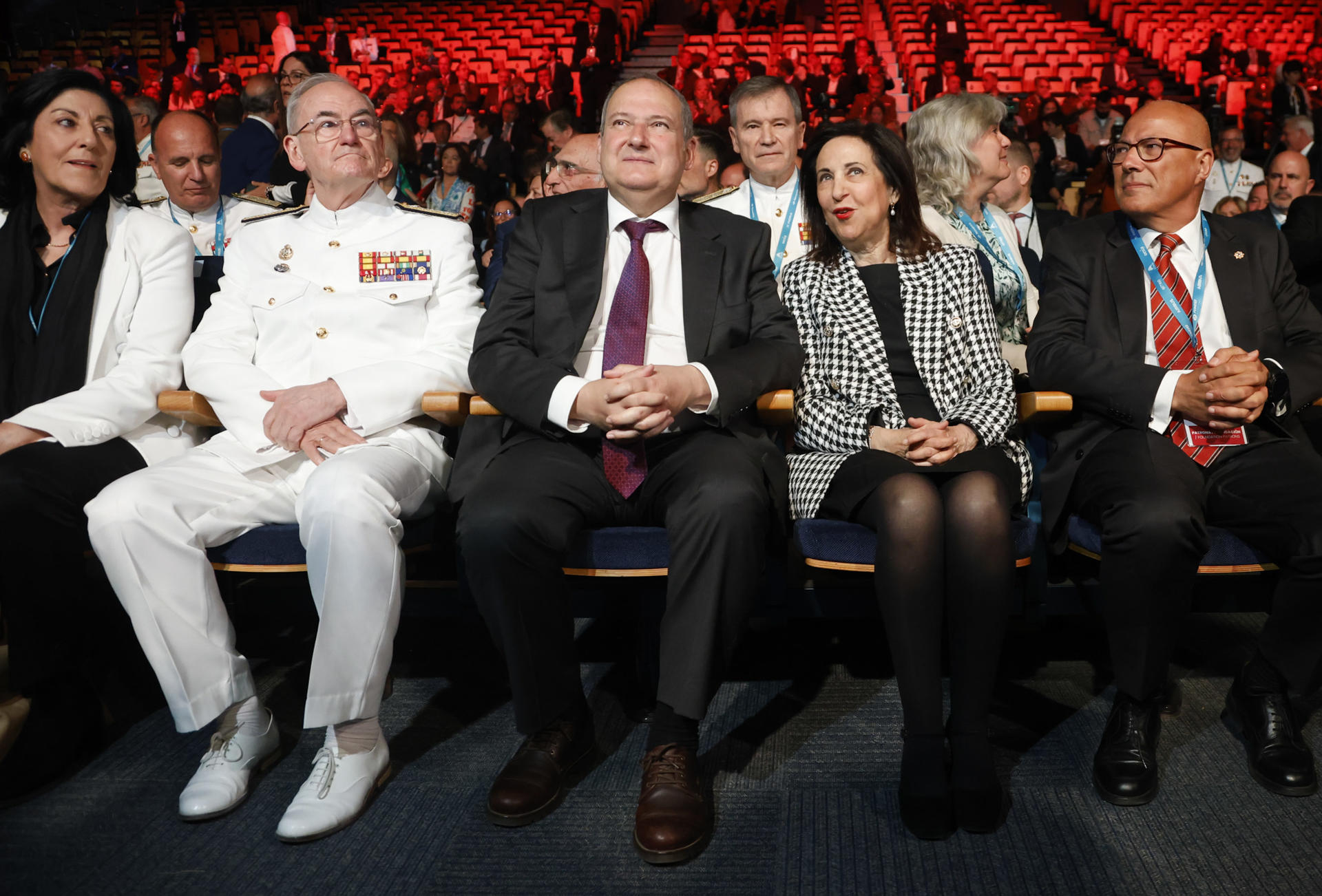 El ministro de Turismo e Industria, Jordi Hereu (3i), junto a la ministra de Defensa, Margarita Robles (2d), junto al presidente de la Fundación Feindef, Ángel Olivares (d), y el Jefe de Estado Mayor de la Defensa, el almirante general Teodoro Esteban López Calderón (2i), durante la inauguración de la Feria Internacional de Defensa y Seguridad de España (FEINDEF) 2025, en el recinto de Ifema, en Madrid. EFE/David Fernández