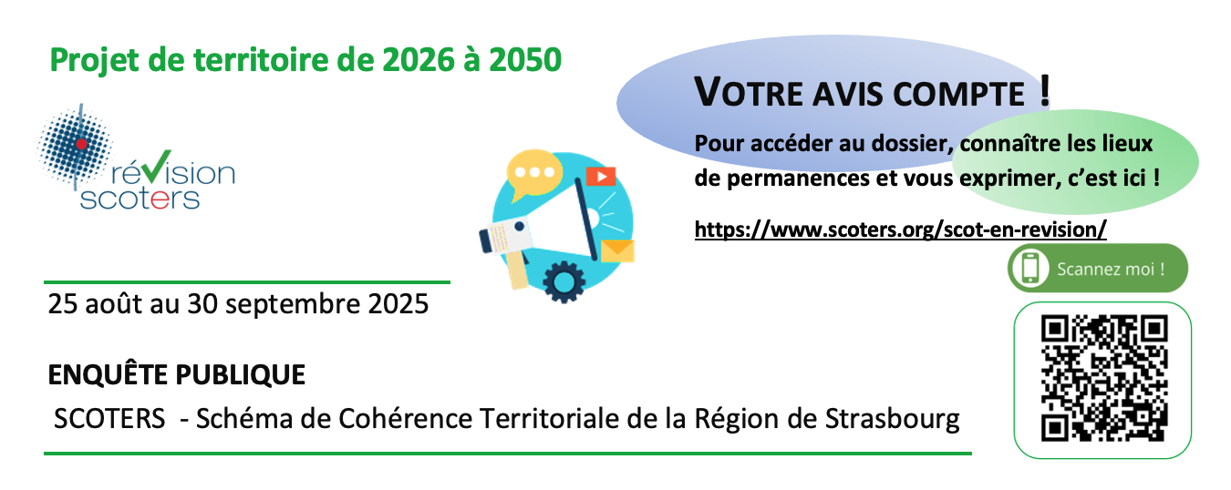 L’enquête publique concernant le projet de SCOTERS (Schéma de Cohérence Territoriale de la Région de Strasbourg) révisé, arrêté le 4 mars, se tiendra du 25 août à 9h au 30 septembre à 17h30.