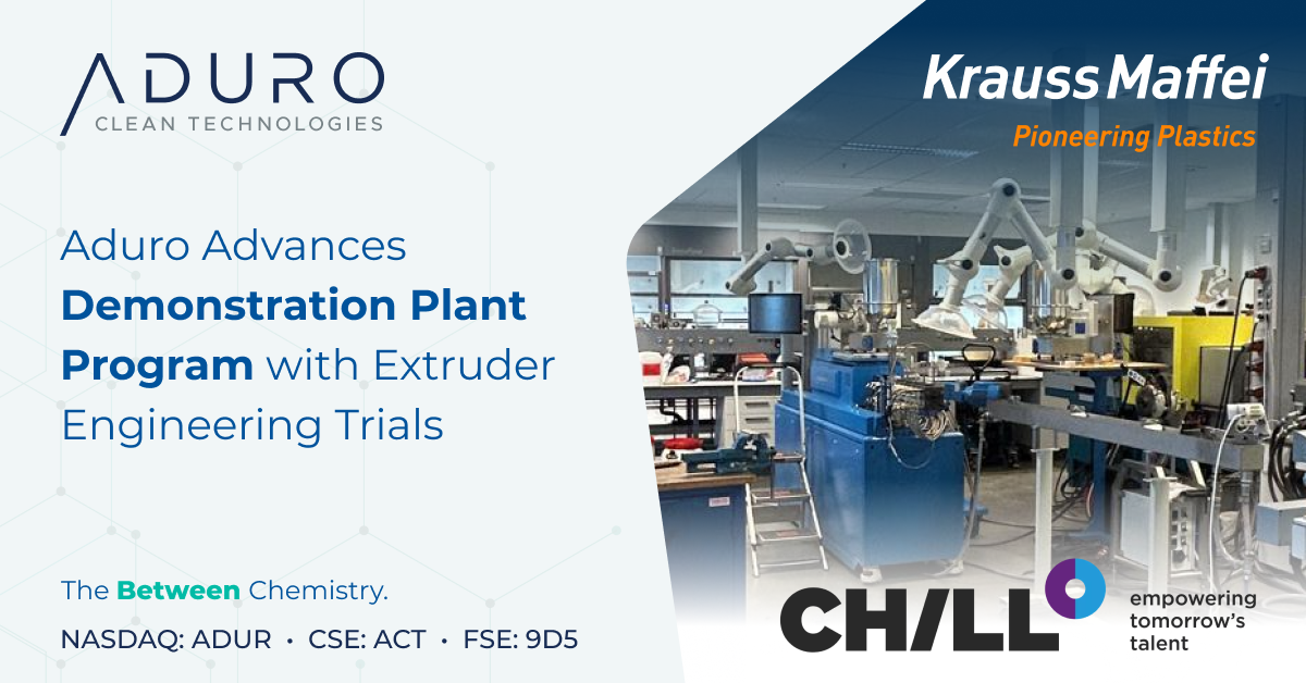 Dans le cadre de ces essais, Aduro va collaborer avec KraussMaffei Extrusion GmbH (« KraussMaffei ») et CHILL B.V. (« CHILL »), alliant ainsi capacités d’ingénierie industrielle et expertise en recherche appliquée. Aduro a précédemment travaillé avec les deux organisations lors de la conception et du développement de l’usine pilote du processus nouvelle génération (PNG), établissant ainsi une base solide pour un progrès continu. S’appuyant sur cette expérience, la phase actuelle se concentre sur l’évaluation de la manière dont les systèmes d’extrusion peuvent préparer et alimenter efficacement les déchets plastiques contaminés du monde réel dans le processus Hydrochemolytic™. La réalisation des travaux dans des conditions d’exploitation réalistes fournira les connaissances pratiques nécessaires à la conception de l’équipement, la stratégie de prétraitement et la planification de l’intégration de l’usine pilote.