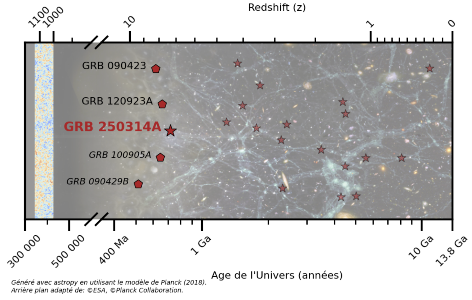 GRB 250314A est le 3ᵉ sursaut gamma le plus lointain dont la distance a été déterminée par spectroscopie.