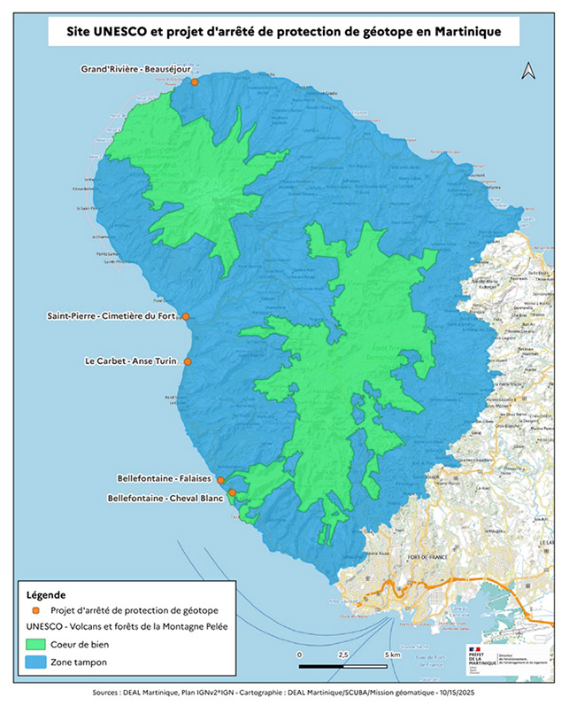 Cette démarche s’inscrit pleinement dans les objectifs de protection du patrimoine naturel et géologique prévus aux articles L411-1 à R411-17-2 du Code de l’Environnement, notamment pour prévenir leur dégradation, altération ou destruction, conformément à l’intérêt scientifique, pédagogique ou historique de ces sites et en lien étroit avec l’appellation le plan de gestion des forêts et volcans de la montagne Pelée et des Pitons du Nord de la Martinique inscrit sur la liste du patrimoine mondial de l’UNESCO acquise en 2023.
