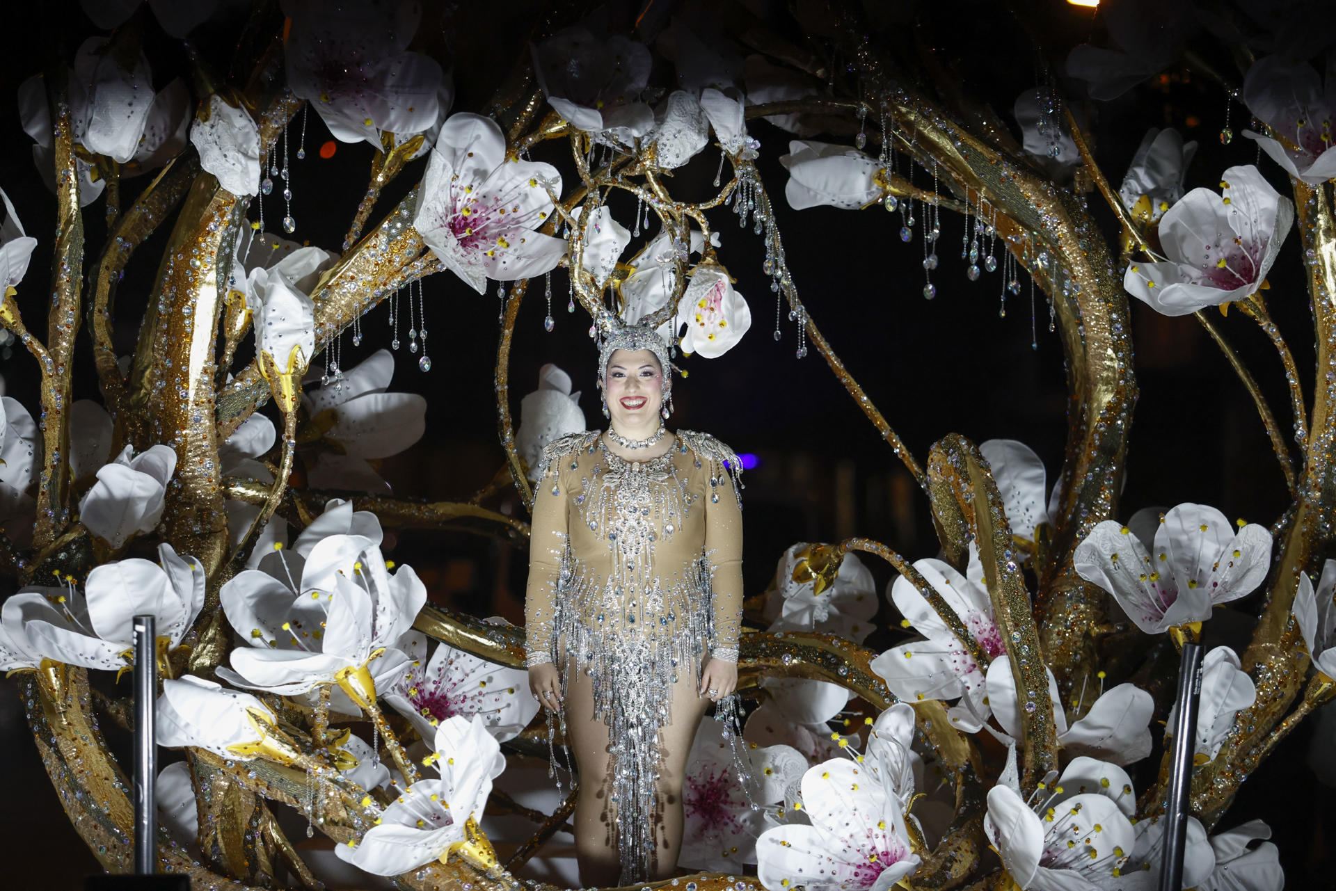 «Esta fantasía se ha compuesto de multitud de pétalos de encaje, organza y satén cubiertos de cientos de brillantes en una estructura que envuelve el cuerpo en una espiral de blancos y rosas que harán que el dulce olor de la flor de ‘SAKURA’ -nombre del traje de la reina- se sienta en toda Torrevieja».