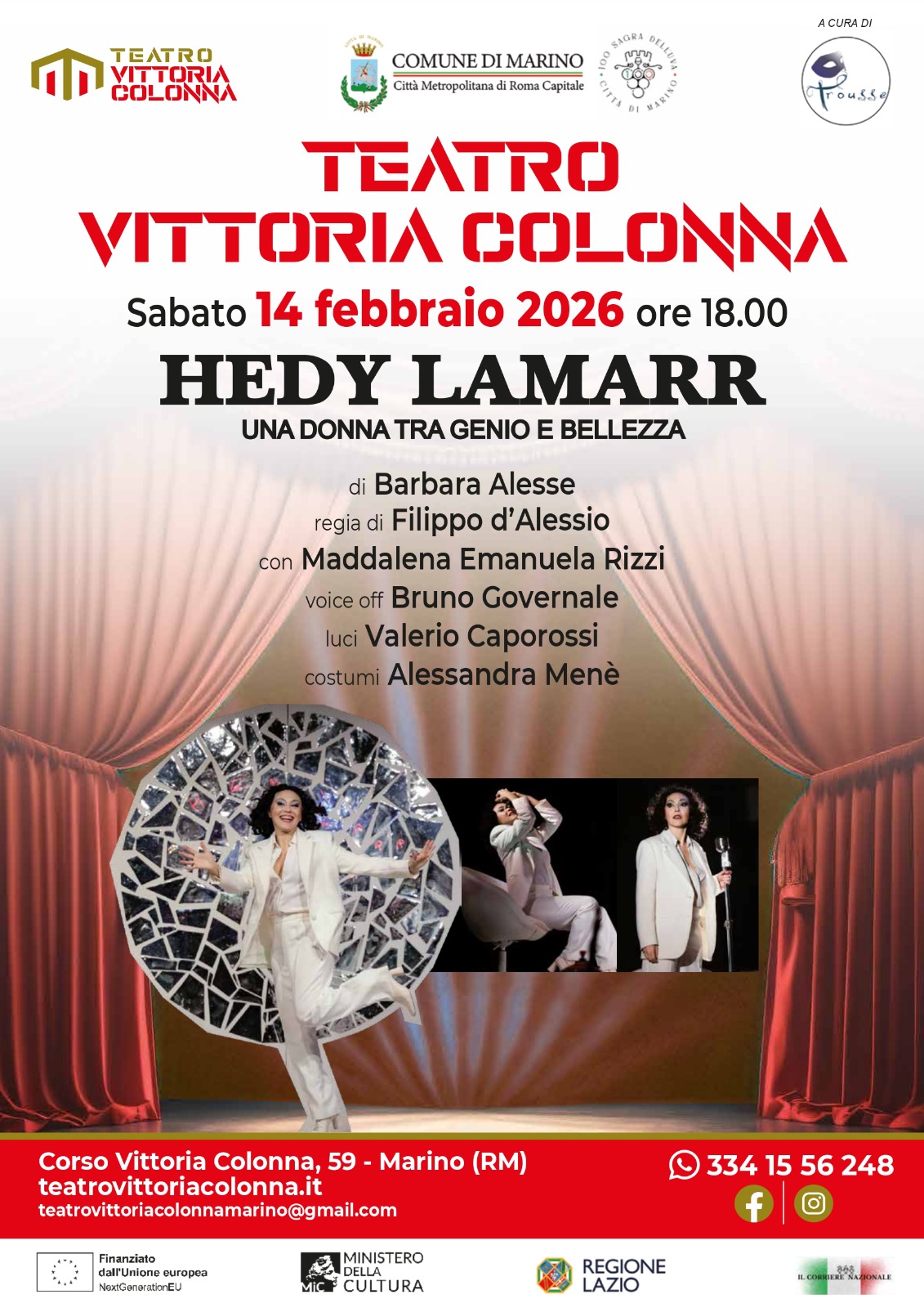 Il primo “Hedy Lamarr” - una donna tra genio e bellezza - di Barbara Alesse si terrà Sabato 14 febbraio 2026 alle ore 18,00 con la regia di Filippo D’Alessio. Protagonista assoluta Maddalena Rizzi. Voice off Bruno Governale, Luci di Valerio Caporossi, Costumi di Alessandra Menè.