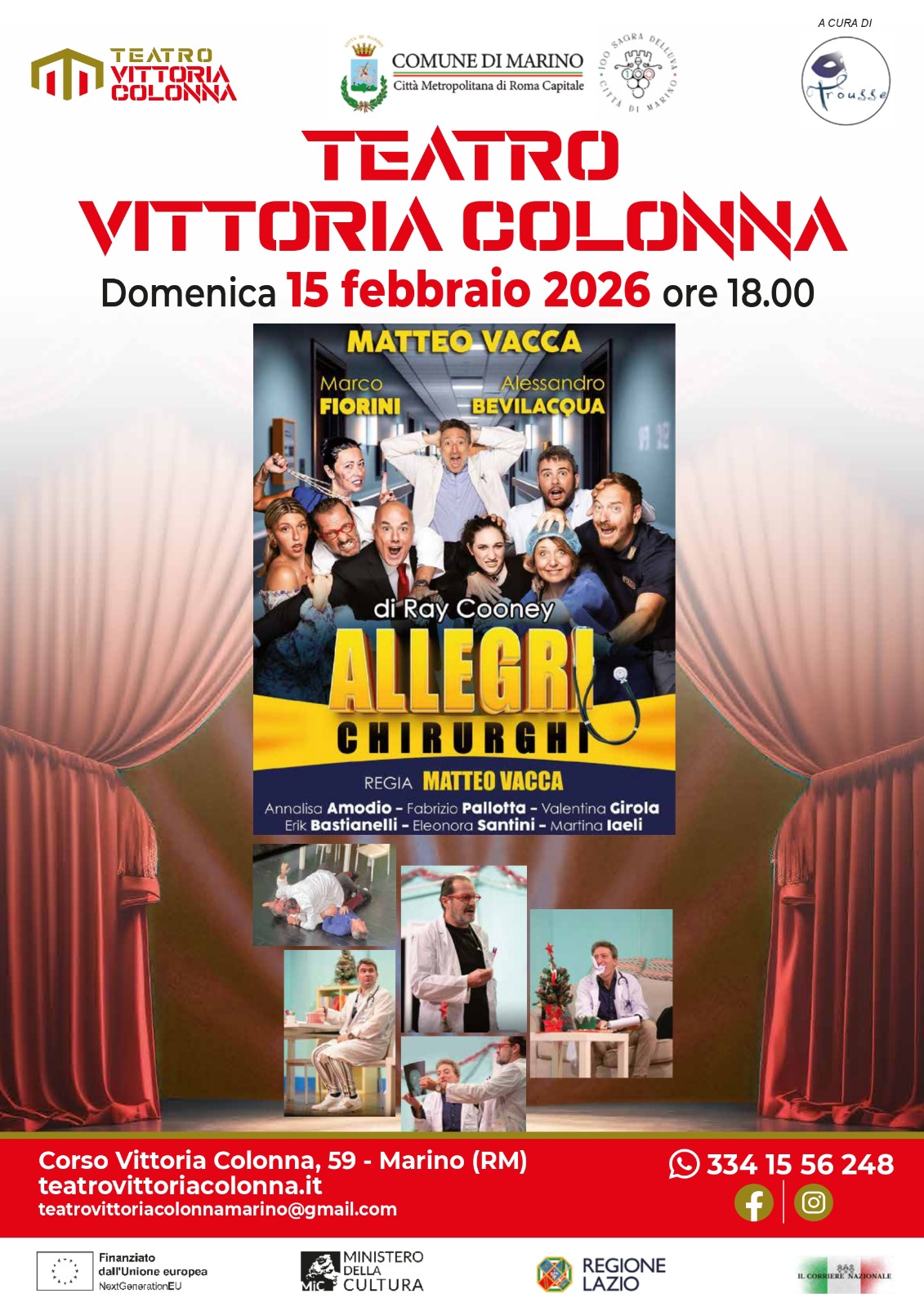 Il secondo “Allegri chirurghi” di Ray Cooney andrà in scena domenica 15 febbraio 2026 alle ore 18,00 con la regia di Matteo Vacca. Sul palco gli attori Matteo Vacca, Marco Fiorini, Alessandro Bevilacqua, Annalisa Amodio, Fabrizio Pallotta, Valentina Girola, Erik Bastianelli, Eleonora Santini e Martina Iaeli.