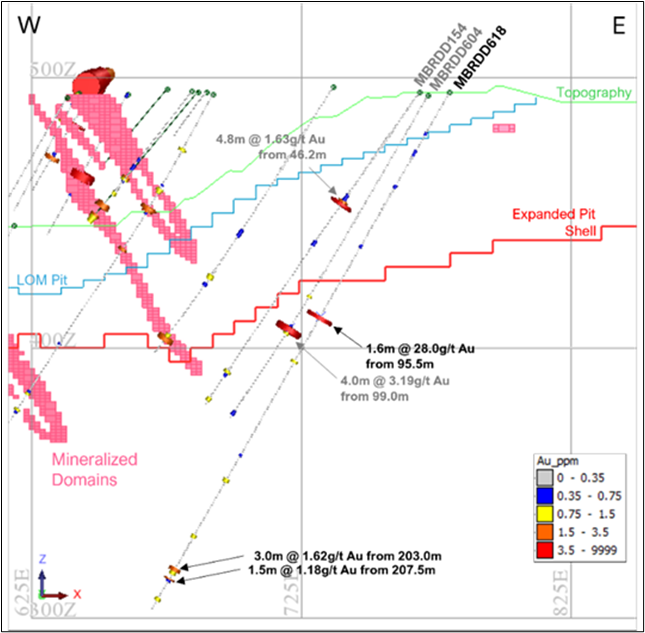 MBRDD616 and MBRDD619 intersected multiple gold mineralized zones at the lower boundary of the expanded pit shell and approximately 60m below the expanded pit shell (approximately 100m below the BRC3 current pit floor) (Figure 7). The area is sparsely drilled, open at depth and along strike. The deepest gold intersections in both holes potentially correspond to modelled mineralized domains approximately 80m to the north. The same mineralized domain was intersected by MBRDD600, MBRDD601 and MBRDD602 (Table 3) [2].