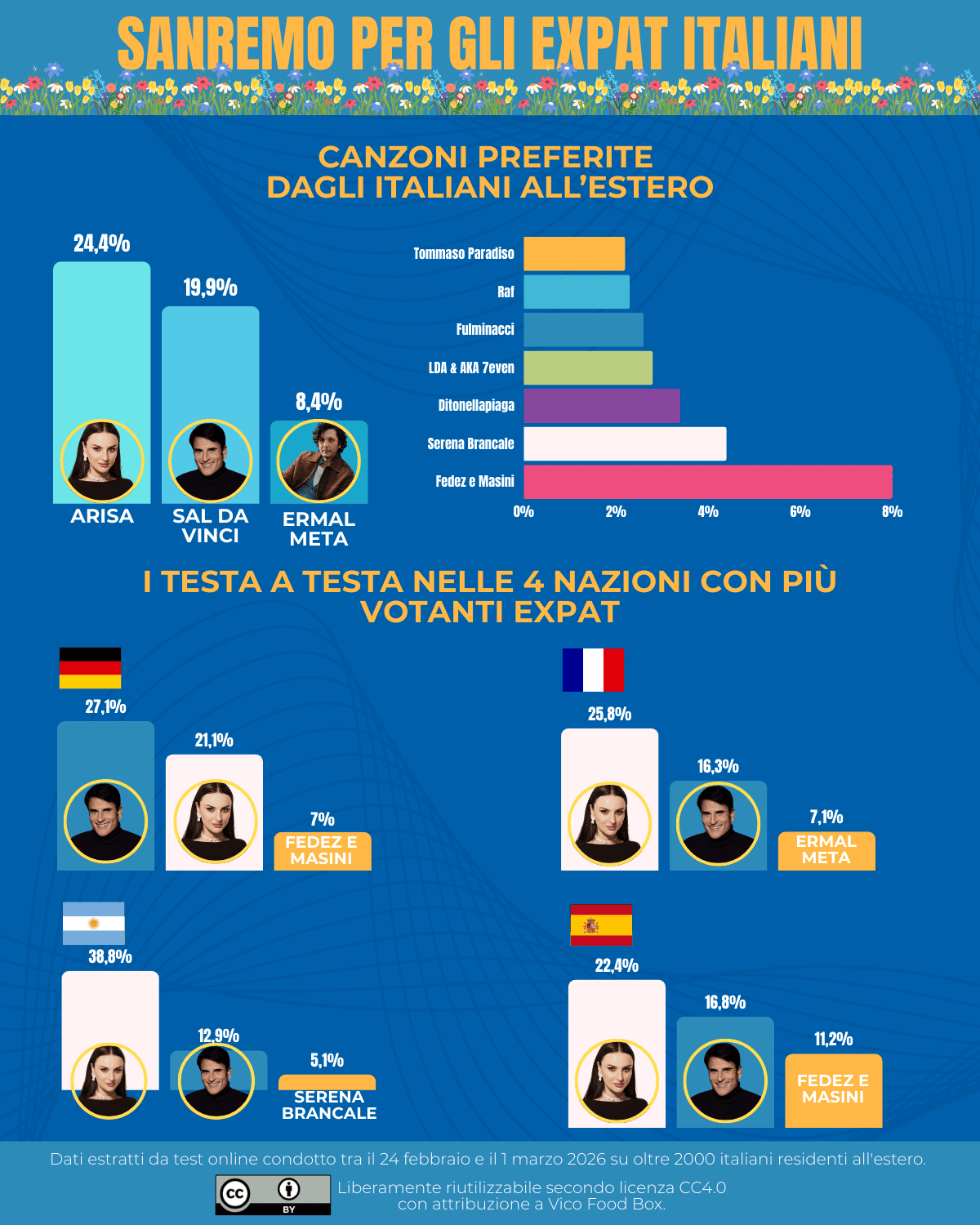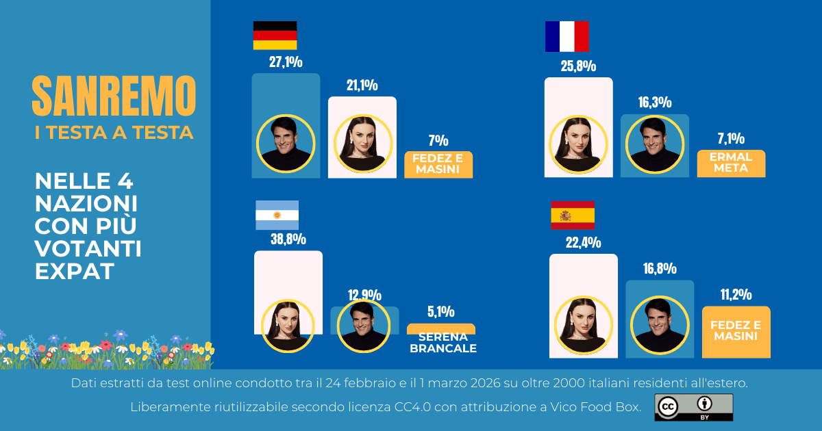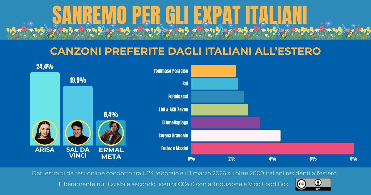 Sanremo è un rito nazionale anche fuori dai confini. Per questo, in occasione del Festival, Vico Food Box ha raccolto le preferenze di italiani residenti all’estero con il questionario “Chi vuoi che vinca Sanremo?”, per osservare se e come il “tifo” cambia quando si guarda l’Italia da lontano.