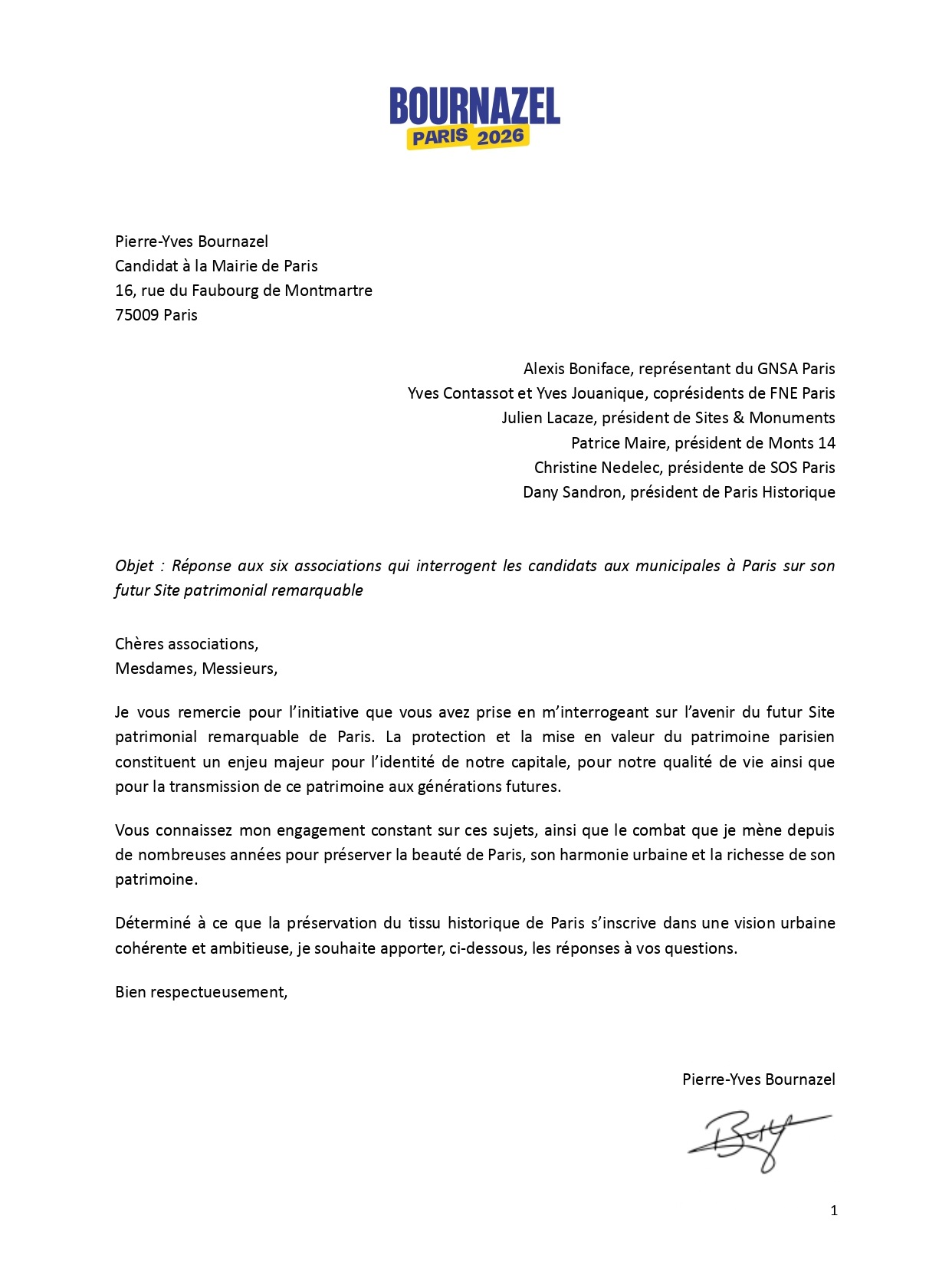 Les six principales associations de défense du patrimoine naturel et bâti parisien, FNE Paris, le GNSA Paris, Monts 14, Paris Historique et SOS Paris, menées par Sites & Monuments, se sont adressées aux six candidats à l’élection municipale à Paris, Pierre-Yves Bournazel (Horizons), Sophia Chikirou (la France insoumise), Rachida Dati (Les Républicains), Emmanuel Grégoire (Parti socialiste - Ecologistes - PCF), Sarah Knafo (Reconquête !) et Thierry Mariani (Rassemblement national) au sujet de son futur Site patrimonial remarquable (SPR) et plus généralement de son patrimoine.