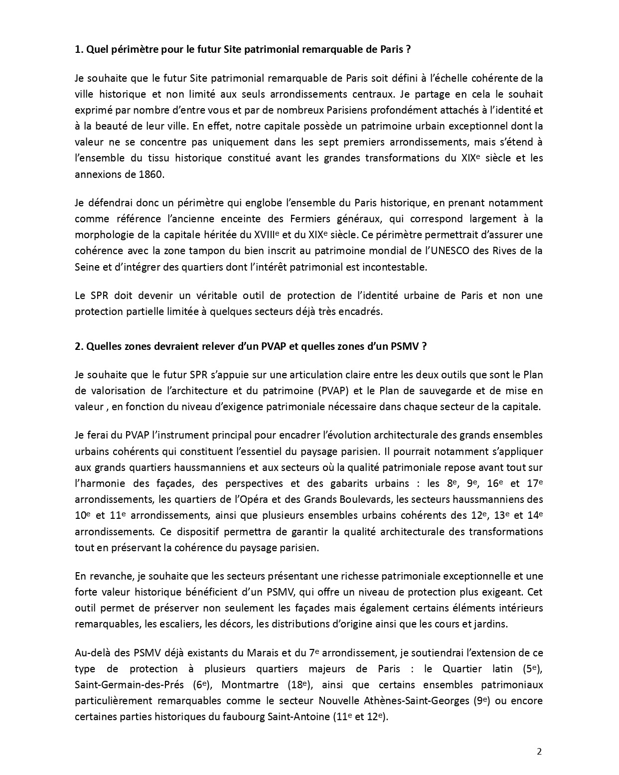 Nous demandions aux candidats - après avoir exprimé notre insatisfaction sur l’emprise comme sur le régime (PVAP principalement) du futur Site patrimonial remarquable de Paris - leur avis sur :