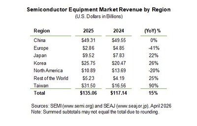 MILPITAS, Calif., April 7, 2026 /PRNewswire/ -- Worldwide sales of semiconductor manufacturing equipment increased 15% to $135.1 billion in 2025 from $117.1 billion in 2024, driven by continued investment in advanced logic, memory, and AI-related capacity expansion, SEMI, the industry association representing the global electronics design and manufacturing supply chain, reported today. The data is available in the Worldwide Semiconductor Equipment Market Statistics (WWSEMS) report.
