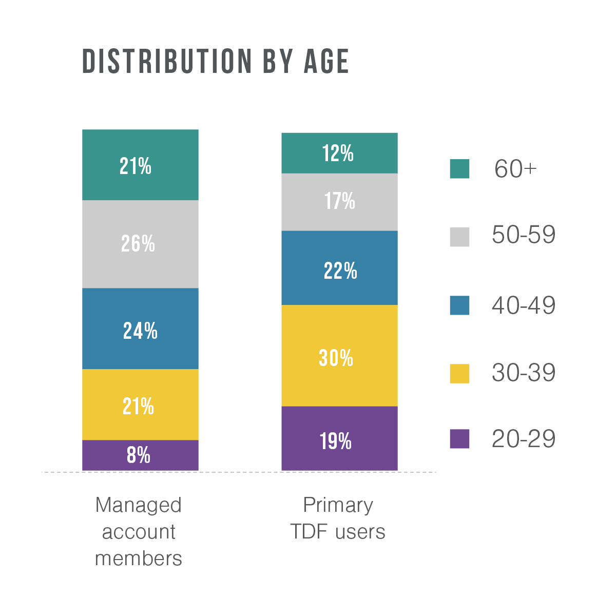 A key takeaway from the report is that managed accounts are driving value for program members that extends far beyond providing help with asset allocation decisions. This can be seen through some of the positive trends in behaviors and outcomes from their use. For example, managed account members are contributing an average of 9.1% of their income to their retirement account, compared to 7.8% for non-members and 7.4% for individuals primarily invested in a single target date fund (TDF). Also, nearly half of managed accounts members are 50 years of age or older (47%) compared to just 29% of primary TDF users, reinforcing that employees need and want a more customized approach to their planning and investment strategy as retirement nears.