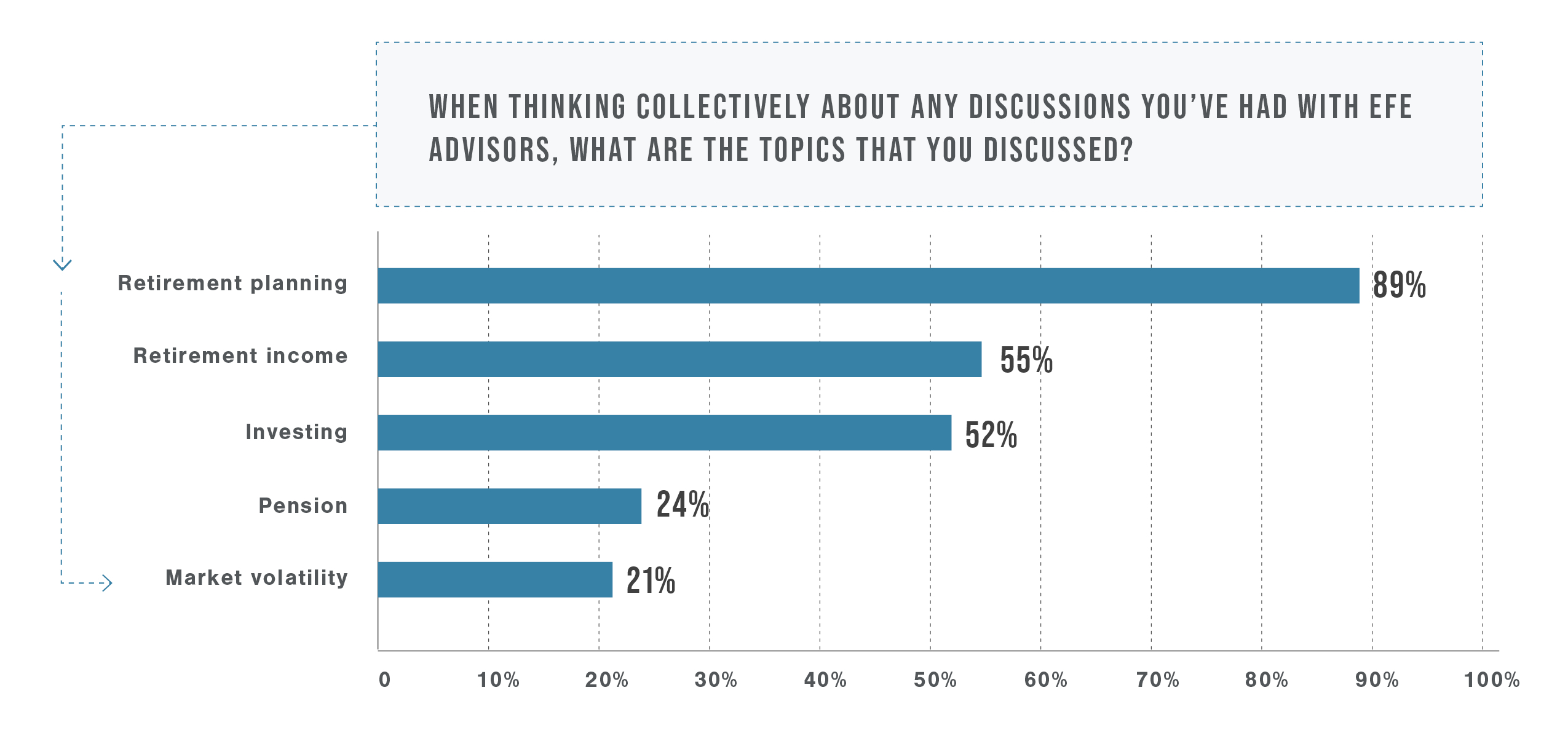 EFE’s research reveals that nearly all managed account members find value in having unlimited access to speak to a licensed, independent advisor as part of the solution. Most importantly, those that engage with advisors find the interaction valuable in helping to achieve their personal financial goals. Market volatility can be one of the most important moments for employees to have the ability to speak with an advisor. Eighty-five percent of members that had a conversation with an advisor surrounding market volatility stated that the conversation prevented them from making a rash decision.