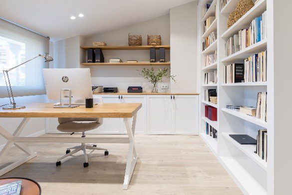 El diseño a medida también está presente en la zona de lectura, un amplio despacho con librería y el lavadero, donde cada rincón ha sido aprovechado para ganar almacenamiento y funcionalidad sin sacrificar el estilo de la vivienda.