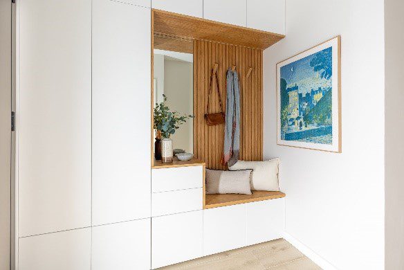 Para el área de recibidor, Laura Martínez ha diseñado un mueble con gran espacio de almacenamiento, que oculta el cuadro eléctrico y las telecomunicaciones, a la vez que ofrece un espejo y un cómodo banco para descalzarse al llegar.