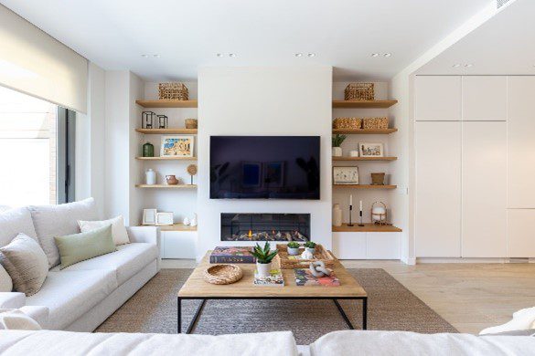 Para hacer el salón más acogedor y cálido se ha apostado por una chimenea: Laura Martínez ha diseñado una estructura de pladur a medida, una solución que permite alojar en la parte inferior la chimenea de gas y que, además, integra el televisor en la parte superior. La perfecta simetría de esta composición se refuerza con dos columnas idénticas a lado y lado, formadas por estanterías de madera y un pequeño compartimento de almacenamiento de objeto en la parte baja.